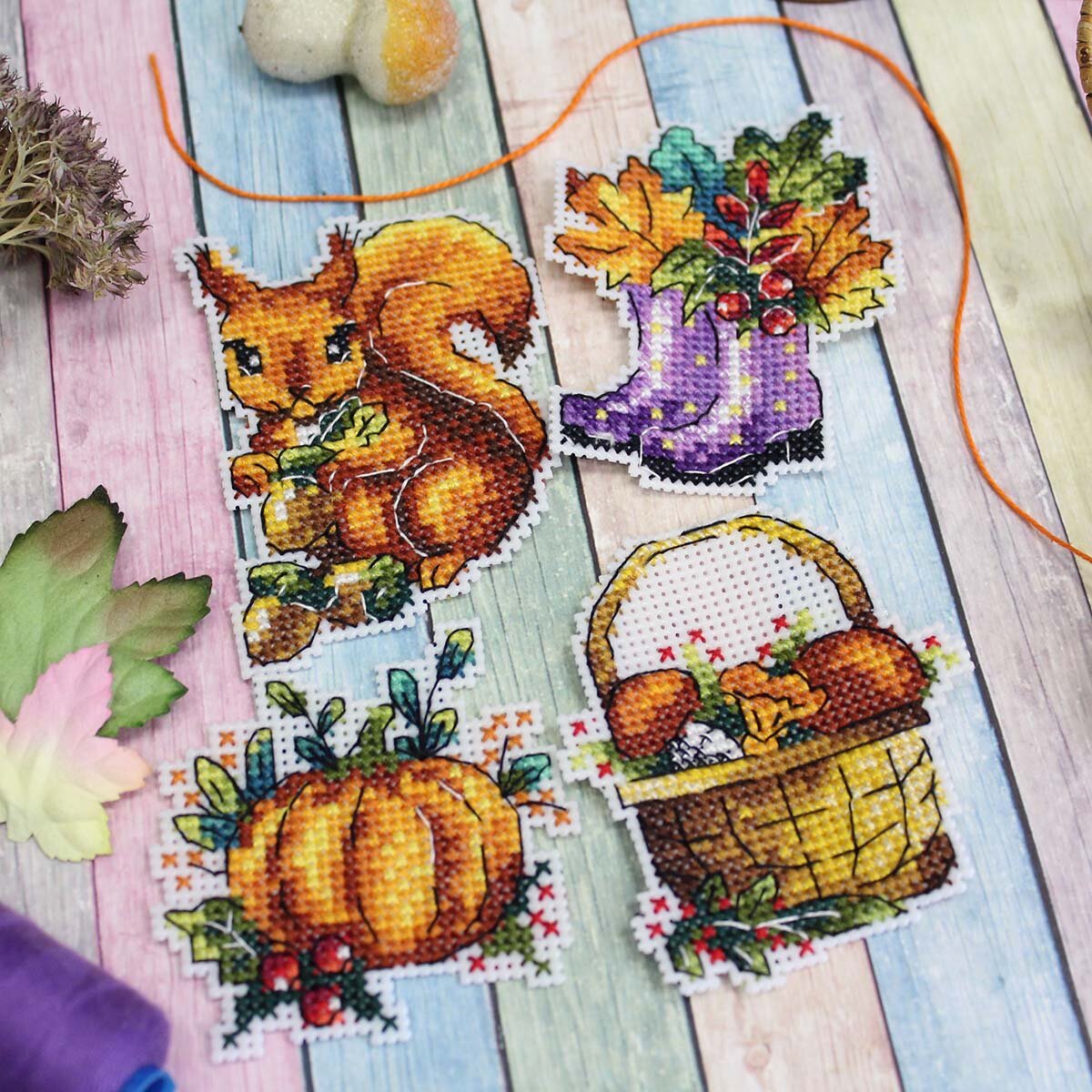 | Комплектация | пластиковая канва для 4-х сюжетов 7x8 см; хлопковое мулине; фетр белого цвета; игла; магнитное полотно; схема; инструкция |