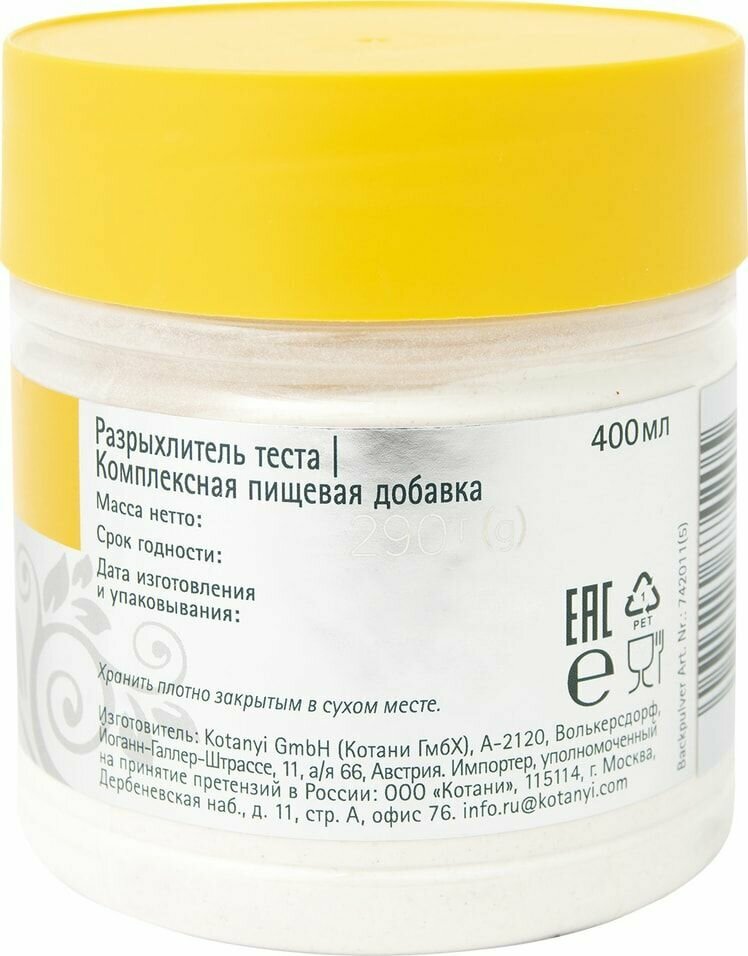 Разрыхлитель теста подходит для всех видов теста. Он не имеет вкуса и легко смешивается. Ваше тесто получится объемным и пышным. Применение: отлично подходит для всех видов выпечки.