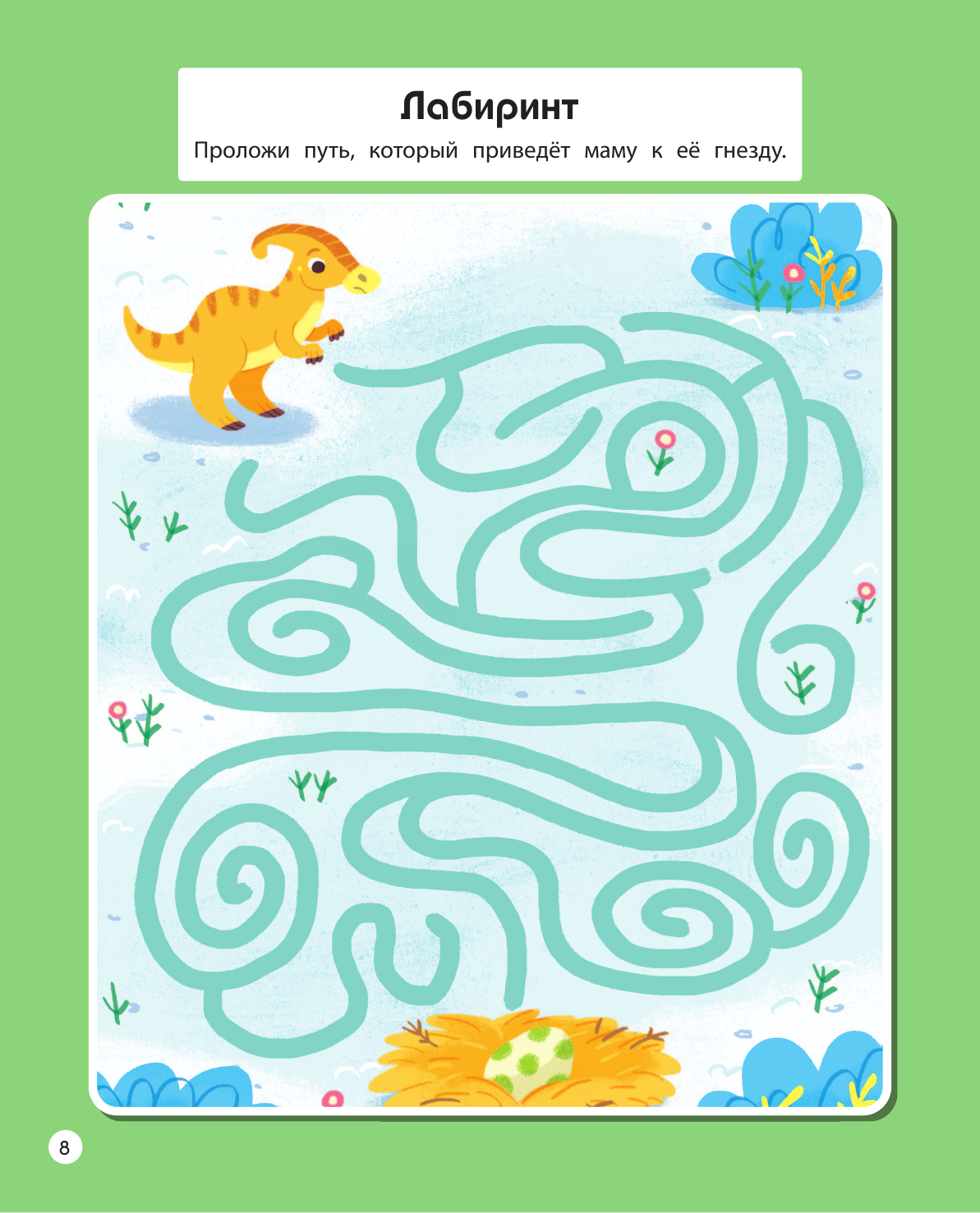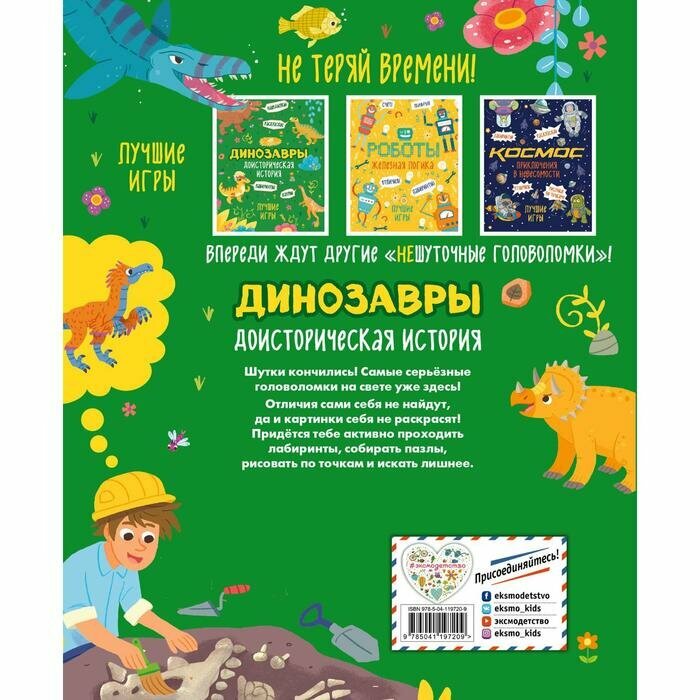 Отправься в далекое и зубастое прошлое на борту нашей книги игр и головоломок. Твоё доисторическое приключение обещает быть очень увлекательным! Впереди ждёт встреча с неизведанным - травоядные динозавры и хищники, крохотные и огромные, с крыльями и с рогами. История до начала времен бросает тебе вызов - проходи лабиринты, собирай пазлы, рисуй по точкам, ищи отличия, раскрашивай и находи спрятавшихся динозавриков. Пройди почти 100 невероятных испытаний в древних джунглях, чтобы по праву получить звание бесстрашного, смышлёного диноисследователя! Прояви смекалку, внимательность и сообразительность, и ты смело можешь называть себя настоящим фанатом динозавров. За дело! Динозавры любят смельчаков! Для младшего школьного возраста.