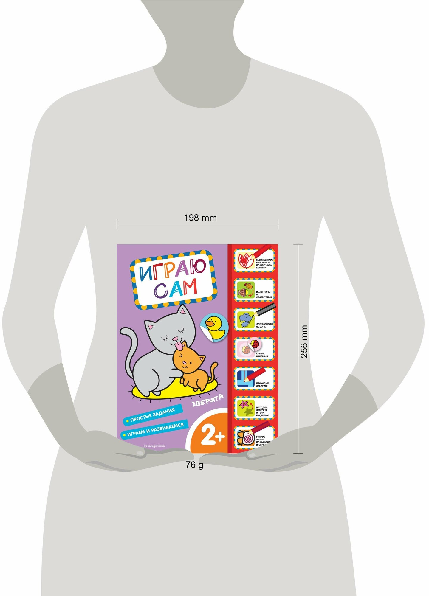 С этой развивающей книжкой ваш малыш сможет заниматься сам, без посторонней помощи! Для этого на каждой страничке есть визуальная инструкция как выполнять задания: - рисовать линии по пунктиру и спиралям; - искать пары и детали предметов; - клеить наклейки; - проходить лабиринт; - раскрашивать фрагменты по цветному контуру; - находить отличия и тени предметов; - дорисовывать зверят. Простые, но увлекательные задачки направлены на то, чтобы развить внимание, мышление и мелкую моторику ребёнка. А яркие картинки с забавными персонажами привлекут его и удержат интерес. Всё, что вам нужно, это цветные карандаши или фломастеры! Не забудьте похвалить малыша за выполненные задания - в конце наклейте поощрительные "медальки". Благодаря ним ребёнок почувствует себя умным и уверенным. Успехов вам и вашим детям! Для детей до 3 лет.