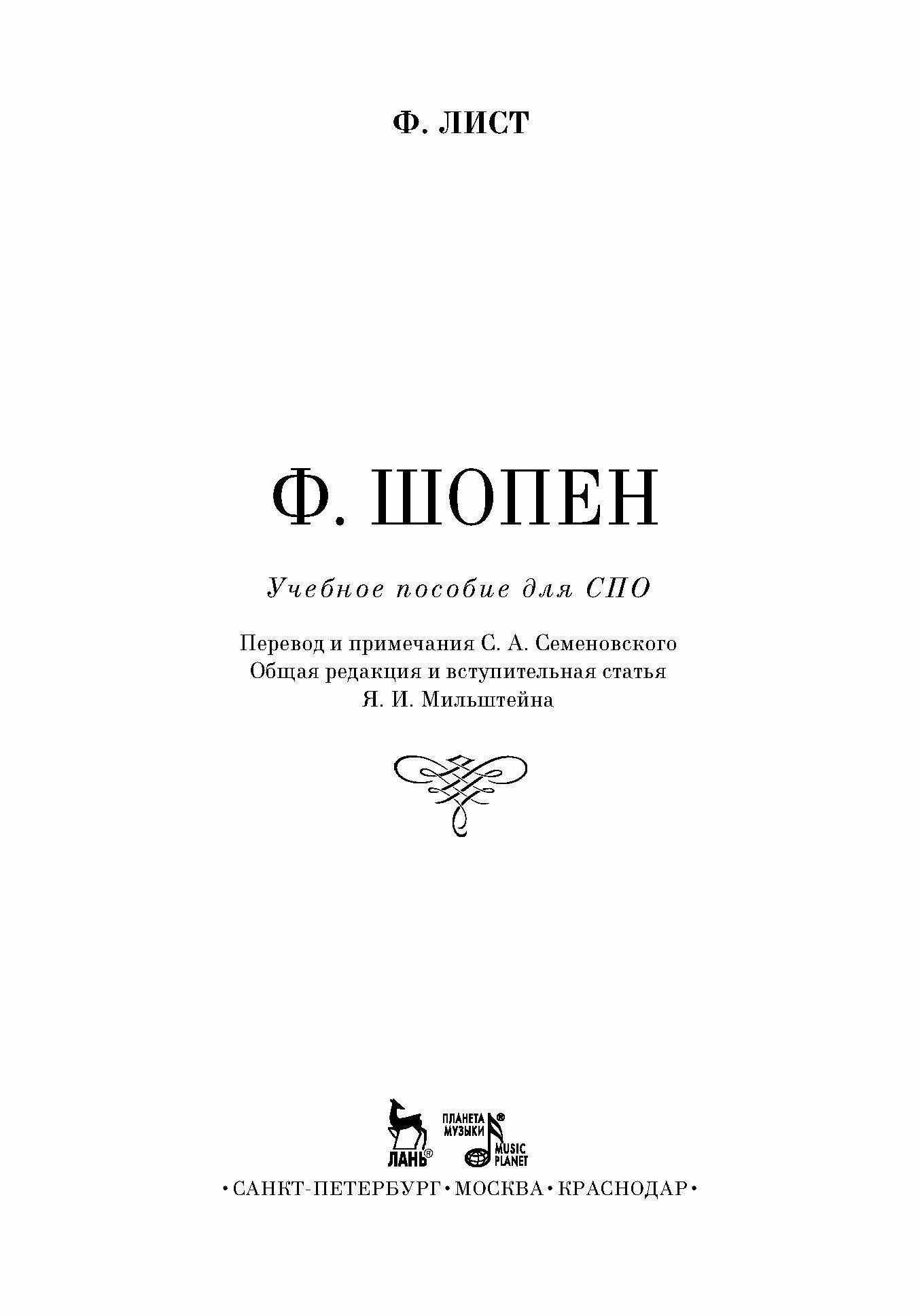 Среди книг, посвященных великим музыкантам, книга Листа о Шопене занимает совершенно особое место. Значение ее определяется прежде всего тем, что она написана не рядовым человеком – литератором, искусствоведом, критиком, – а истинно великим музыкантом-художником. Перед нами не просто книга о Шопене, а книга одного великого человека о другом, книга гения о гении. Более того, перед нами своеобраз-нейший исторический и психологический документ эпохи. Это – взволнованная автобиографическая исповедь художника, остро чувствующего свое одиночество в буржуазном обществе и смело выступающего в защиту благородных идеалов прогресса и гуманизма. Книга предназначена для студентов и преподавателей средних специальных учебных заведений, а также для широкого круга читателей.