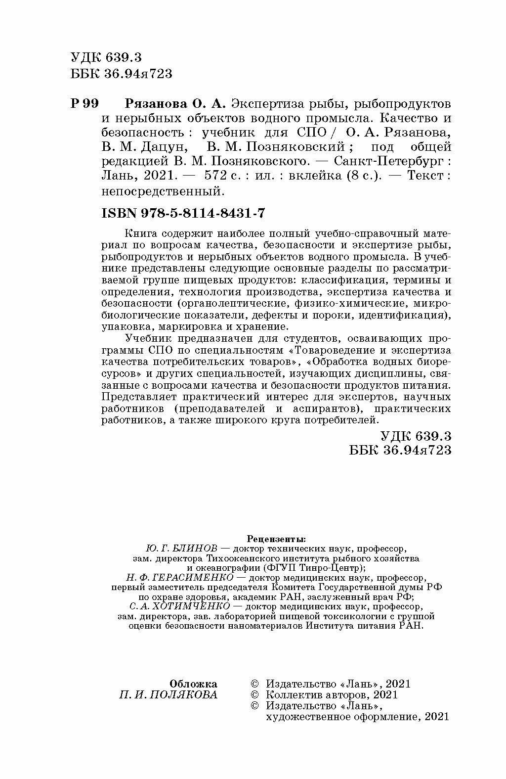 Книга содержит наиболее полный учебно-справочный материал по вопросам качества, безопасности и экспертизе рыбы, рыбопродуктов и нерыбных объектов водного промысла. В учебнике представлены следующие основные разделы по рассматриваемой группе пищевых продуктов: классификация, термины и определения, технология производства, экспертиза качества и безопасности (органолептические, физико-химические, микробиологические показатели, дефекты и пороки, идентификация), упаковка, маркировка и хранение.