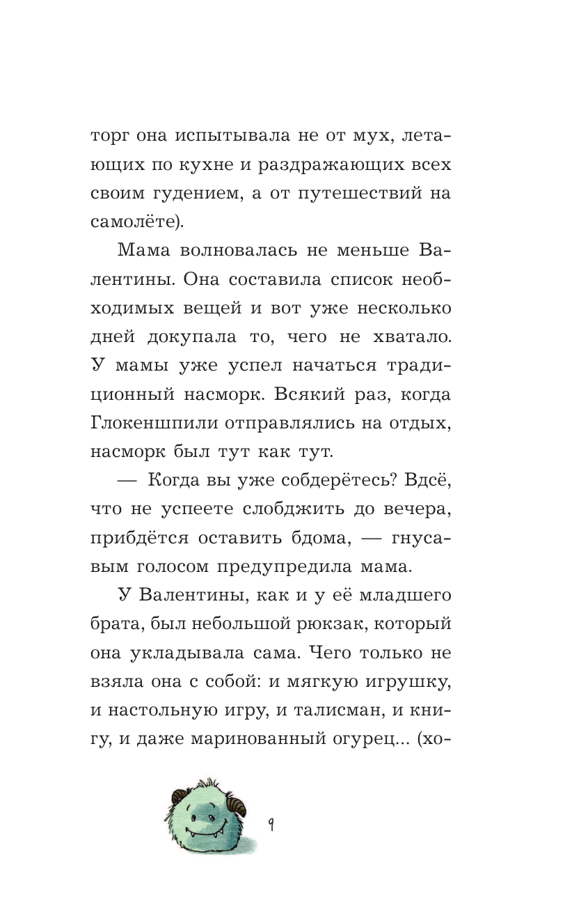 Веселая история про путешествие семейки, мечтавшей посетить Грецию и оказавшейся в Исландии. На улице непогода, мест в отеле нет, что же делать? Спасибо служащему аэропорта, подсказавшего семье остановиться в небольшом отеле Вкривь и вкось. Все бы ничего, но это старый отель, населенный монстриками. О, нет, они не злые. Они сами до ужаса бояться людей. Если бы не игрушка девочки Валентины, которую монстрики приняли за себе подобного, семья бы не поселилась даже в этом отеле. Короче, плюшевый заяц по имени Медведь-вонючка им крупно помог. Ну, а далее с семейкой происходят забавные приключения, их заселяют в маленькую комнатку, из окна которой открывается фантастически красивый вид на город, а в шкафу живет монстрик Амадей, играющий своим длинным носом на скрипке. И стоит проживание в номере совсем ничего, несколько липких, зелёных козюлек от монстриков. Семья ходит в ресторан и поражается блюдам, которые подают. В конце на празднике монстры узнают, что заселившаяся к ним семя - это люди, и они приходят в ужас. Дело в том, что среди монстриков бытует мнение, что люди ужасны, потому что они едят монстров. Но в итоге все заканчивается хорошо, все подружились и полюбили друг друга.