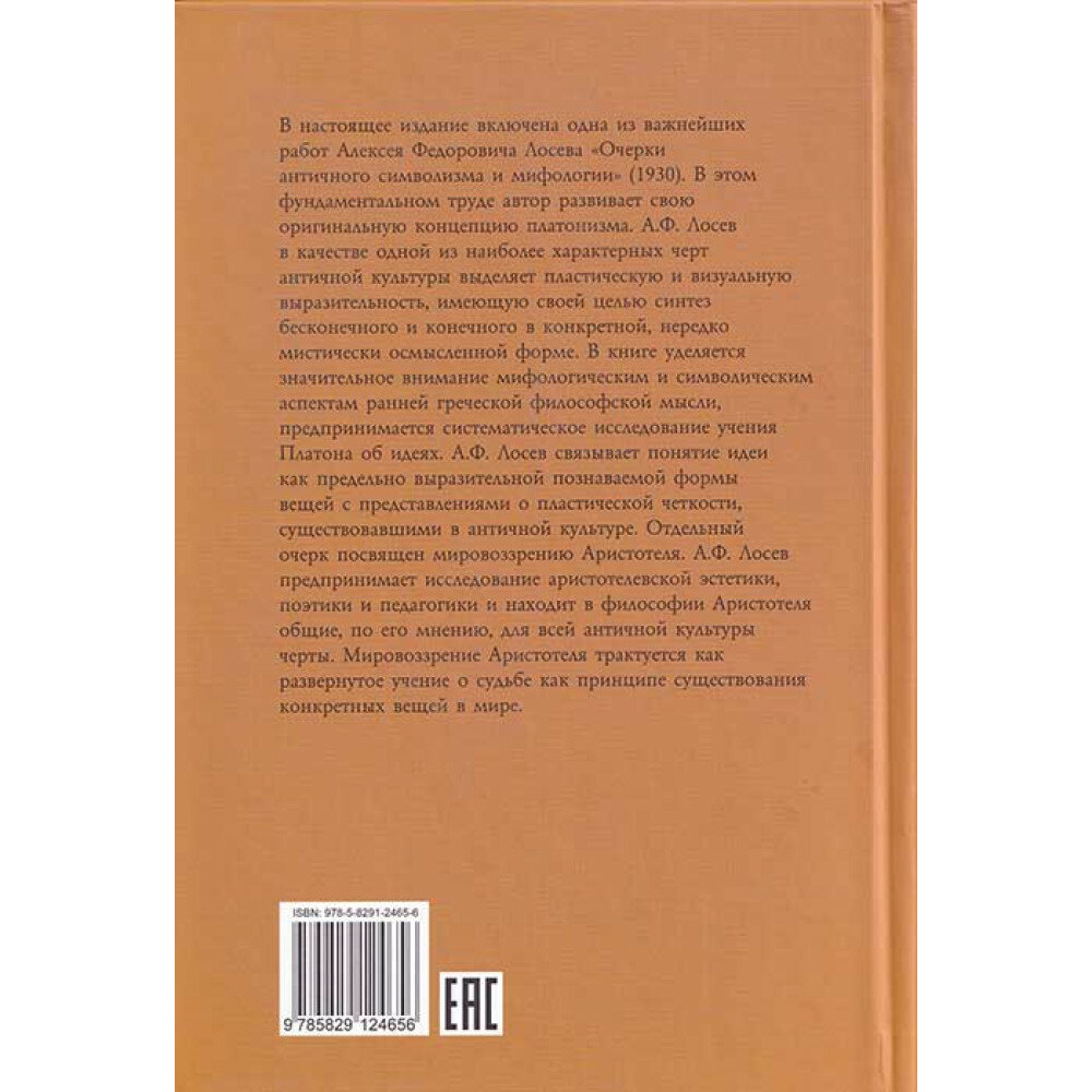 В настоящее издание включена одна из важнейших работ Алексея Федоровича Лосева «Очерки античного символизма и мифологии» (1930). В этом фундаментальном труде автор, на широком фактическом материале исследуя античную мысль и культуру, а также историю восприятия Античности европейской культурой, развивает свою оригинальную концепцию платонизма. Сделав обзор наиболее влиятельных теорий символического, разработанных западными мыслителями XIX—начала XX в., Лосев в качестве одной из наиболее характерных черт античной культуры выделяет интуиции телесности и пластическую и визуальную выразительность, имеющую своей целью синтез бесконечного и конечного в конкретной, нередко мистически осмысленной форме. В книге уделяется значительное внимание мифологическим и символическим аспектам ранней греческой философской мысли, предпринимается систематическое исследование учения Платона об идеях. Лосев связывает понятие идеи как предельно выразительной познаваемой формы вещей с представлениями о пластической четкости, существовавшими в античной культуре. Отдельный очерк посвящен мировоззрению Аристотеля. С целью дать полную картину мировоззрения философа Лосев предпринимает исследование аристотелевской эстетики, поэтики и педагогики и находит в философии Аристотеля общие, по его мнению, для всей античной культуры черты. Мировоззрение Аристотеля в «Очерках…» трактуется как развернутое учение о судьбе как принципе существования конкретных вещей в мире.