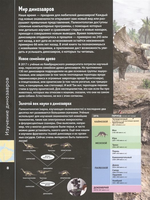 Мезозойская эра — время таинственных и удивительных динозавров. Всё об ужасных ящерах суши, воды и неба, их эволюции, жизни и гибели, в том числе новые данные науки — в умной книге для умных читателей, которые ищут самую новую и достоверную информацию. Действительно ли вымерли динозавры или стали современными птицами? Кто из этих ужасных ящеров был покрыт перьями? Куда ведут окаменелые следы? Эта книга не только расскажет, но и покажет вам настоящих динозавров. Удивительные возможности виртуальной реальности помогут каждому заглянуть в мир мезозойской эры. Динозавры такие реальные, как будто ты рядом с ними! Более 30 удивительных клипов о жизни динозавров, новые исследования палеонтологов и ответы на многие вопросы. Узнай и будь в курсе! Ссылка на бесплатное приложение и четкие инструкции внутри книги. Скачай, листай, слушай, смотри, удивляйся!
