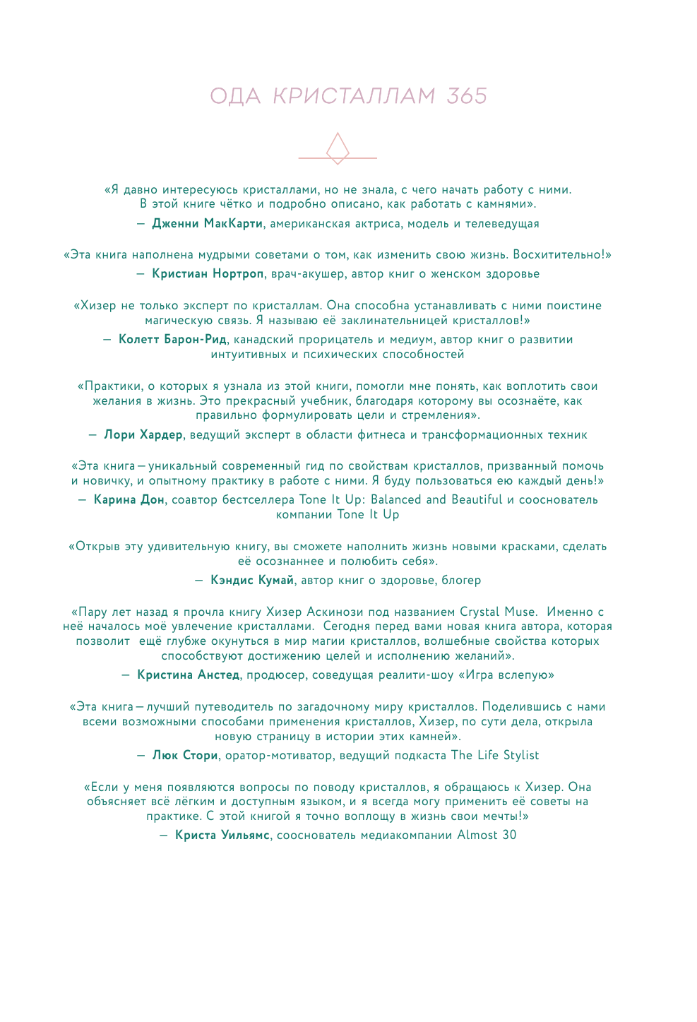 Давно слежу за Хизер Аскенози-прекрасной «укротительницей» камней.решила приобрести ее книгу.я в полном восторге : шикарные иллюстрации, краткое описание самых необходимых камней( сортировка по запросам, а не по алфавиту-очень удобно), к каждому камню несколько практик и рекомендаций по работе. Однозначно рекомендую, как для начинающих, так и для опытных! Благодарю читай-город за возможность приобретать такие нужные книги