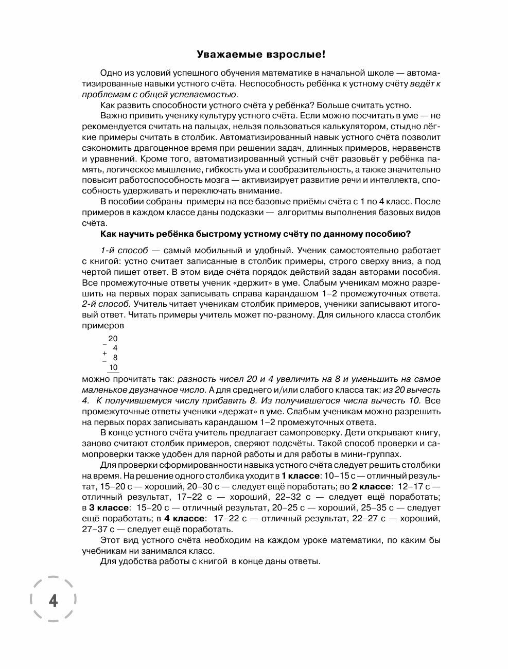 В пособии представлены примеры на все базовые приёмы устного счёта с 1 по 4 класс. Очень важно, чтобы ребёнок усвоил навык устного счёта до автоматизма. Автоматизированный навык устного счёта поможет в решении не только учебных, но и практических задач, разовьёт память ребёнка, способность удерживать и переключать внимание. Столбики-цепочки ребёнок считает устно строго сверху вниз и записывает ответ. В конце блока примеров в каждом классе даны подсказки - алгоритмы счёта, а в конце книги - ответы для самопроверки. Пособие можно использовать на уроке в школе и для самостоятельных занятий дома.