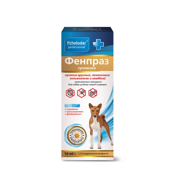 Лекарственный препарат Фенпраз суспензия назначают собакам с 3-недельного возраста с профилактической и лечебной целью при нематодозах (токсокароз, токсаскаридоз, унцинариоз, анкилостомоз, трихоцефалез), цестодозах (тениидозы, дипилидиоз, эхинококкоз, дифиллоботриоз, мезоцестоидоз) и гиардиозе (лямблиозе).Фенпраз суспензия (Fenpraz suspension) для собак средних, крупных пород и щенков в 1 мл (на 4 кг веса) в качестве действующих веществ содержит: пирантела памоат - 56 мг, празиквантел - 20 мг, фенбендазол - 6 мг и вспомогательные вещества.По внешнему виду препарат представляет собой суспензию светло-желтого цвета.Лекарственный препарат Фенпраз суспензию применяют животным внутрь однократно, индивидуально, в утреннее время в следующих дозах: собакам средних пород и щенкам в дозе 1 мл на 4 кг массы животного с небольшим количеством корма или непосредственно внутрь в защечную область при помощи шприца-дозатора.Противопоказанием к применению лекарственного препарата является индивидуальная повышенная чувствительность животного к компонентам лекарственного препарата (в том числе в анамнезе). Не следует применять лекарственный препарат истощенным, больным инфекционными болезнями и выздоравливающим животным.Возможность применения препарата Фенпраз суспензия самкам в период беременности и вскармливания приплода определяет лечащий ветеринарный врач на основании оценки соотношения пользы и возможного риска его применения. Не допускается дегельминтизация в первой половине беременности и ранее чем через 2-3 недели после родов, а также щенков моложе 3-недельного возраста.Лекарственный препарат Фенпраз суспензия не предназначен для применения продуктивным животным.Лекарственный препарат хранят в закрытой упаковке производителя, в защищенном от прямых солнечных лучей месте, отдельно от продуктов питания и кормов при температуре от О C до 25 C. После первого вскрытия флакона - не более 3-х недель в темном месте при температуре 6-8 C.Срок годности лекарственного препарата при соблюдении условий хранения в закрытой упаковке производителя - 3 года от даты производства.Запрещается применение лекарственного препарата по истечении срока годности.Неиспользованный лекарственный препарат утилизируют в соответствии с требованиями законодательства.Лекарственный препарат следует хранить в недоступном для детей месте!