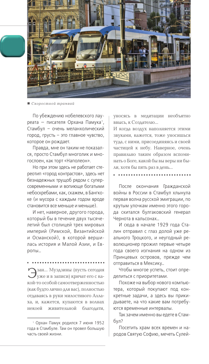 Путеводитель максимально бестолковый, это не путеводитель, а путевые заметки, отражающие личное восприятие города автором, полные советов - не торопитесь, слейтесь с городом... Нет исторических фактов, почти ни одной даты. Приведены какие-то мифы, которые рассказывают гиды туристам, но на что мне эти мифы? Указаны достопримечательности, непонятно, как к ним добираться, нет часов работы музеев. В результате к путеводителю вам еще нужен работающий интернет. Карта метро такого размера, что хочется плакать, 4-тый шрифт примерно. Цены на все устарели еще много лет назад, начиная с проезда в транспорте, хотя путеводитель свежий. В путеводителе всего 2 или 3 прогулки по центру, вообще ничего про азиатскую сторону, даже карты простецкой нет. Предпочел этот путеводитель другому, который был в 2 раза дешевле, и пожалел, потому что этот тяжелый, а карта есть только самого центра, поэтому нужно раздобыть еще где-то карту города.