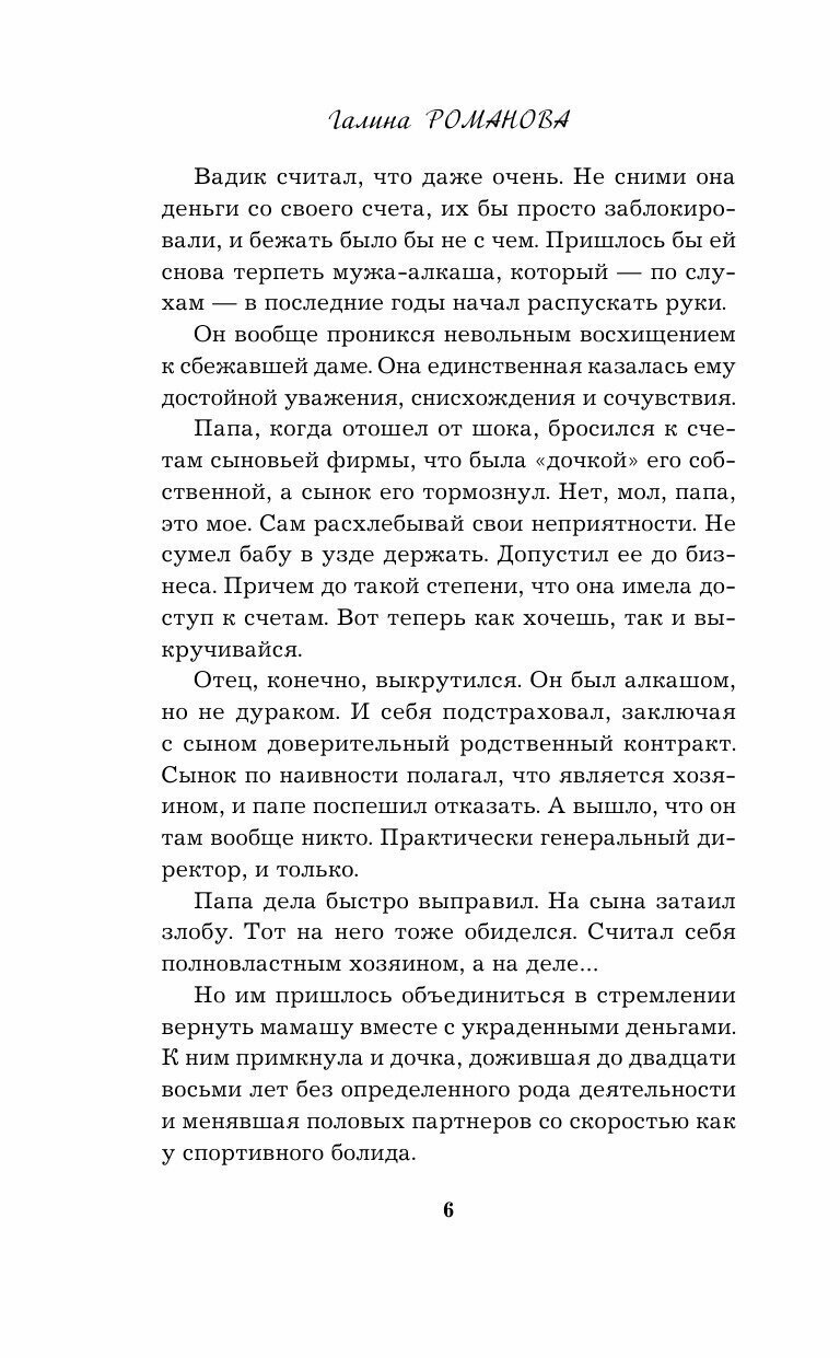В семье крупного бизнесмена Суворова давно отлаженная и внешне благополучная жизнь разрушена - его жена Элеонора сбежала, прихватив со счетов мужа крупную сумму, которую она обналичила в банке по соседству. Там работал ее сообщник и по совместительству любовник Сергей Пронин. Но скрыться парочка не успела: вскоре Сергей был убит в своей машине, стоявшей во дворе. Полиция сначала сочла, что его смерть наступила по естественным причинам, но экспертиза установила: он был отравлен крайне изощренным способом… Галина Романова - подлинный знаток человеческих чувств и отношений. В ее детективных мелодрамах из серии "Метод женщины" переплетаются и кровь, и слезы, и любовь. Все, как в реальности, когда один-единственный шаг отделяет нас от любви до ненависти, от дружбы до любви, от рождения до смерти. Нежные чувства проверяются настоящими испытаниями, где награда - сама жизнь.