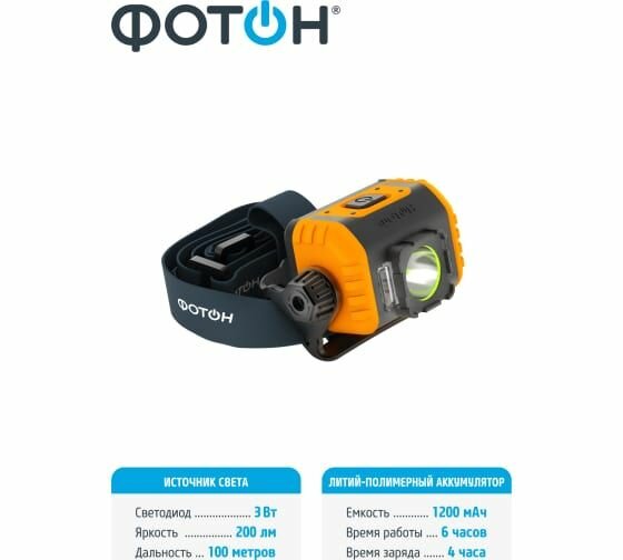Светодиодный налобный аккумуляторный фонарь ''Фотон'' - отличное решение для использования в путешествиях, туристических походах и домашних условиях. Литий-полимерный аккумулятор емкостью 1000 мАч позволит проработать до 5 часов. 3 режима работы позволяет выбрать оптимальную яркость и увеличить время автономной работы. Фонарь оснащен датчиков движения, который позволит его включить без нажатия грязными руками или не снимаю рукавиц. Класс защиты от пыли и влаги IP54. Регулируемый угол наклона корпуса и настраиваемая по длине эластичная лента. Фонарь имеет компактные размеры и малый вес. За счет встроенного флуоресцентного кольца вокруг линзы фонарь можно заменить в темноте. Корпус изготовлен из АСВ-пластика и резины.