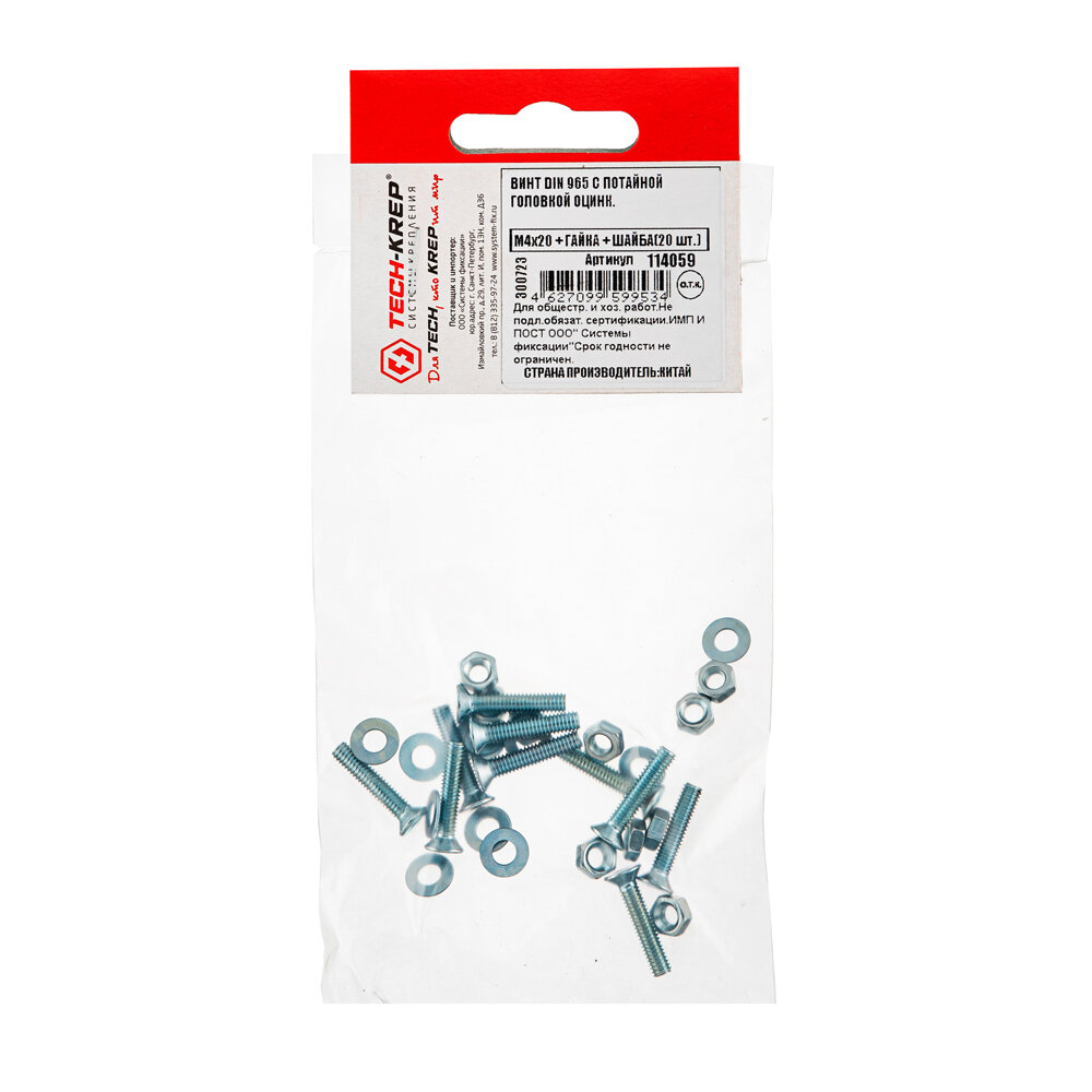 винт din965 с потайной головкой оцинк. m4х20 + гайка + шайба (20 шт) - пакет tec Tech-Krep