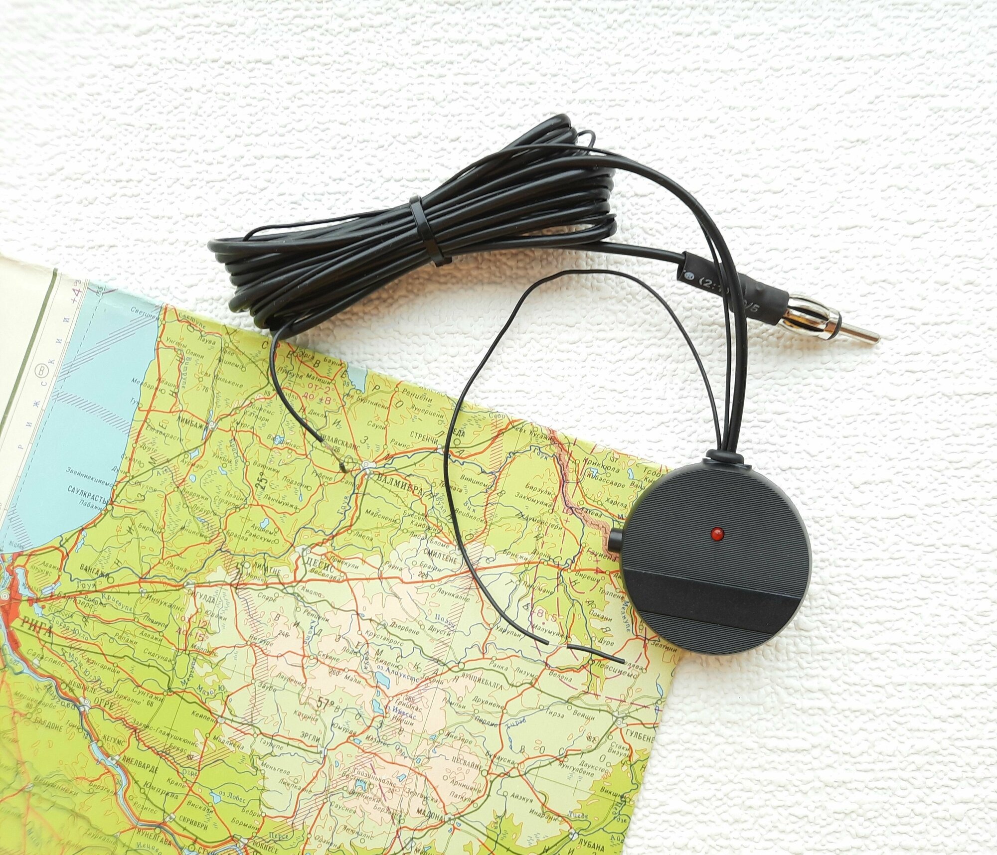 Корпус антенны сделан из черного пластика (по форме толстый диск радиусом 4,5 см и толщиной 1,8 см), который приклеивается в правый пассажирский угол лобового стекла на двусторонний черный скотч. Иногда такие антенны в народе называют таблетка. Из корпуса выходят тонкие металлизированные самоклеющиеся приемные полотна (усы), которые также приклеиваются на стекло. Приемные усы можно развернуть под любым углом, чтобы антенну можно было установить как в угол стекла, так и по центру под зеркало заднего вида. Корпус антенны состоит из двух частей. При установке сначала на выбранное место клеится первая часть корпуса, усы надеваются на штырек этой части, приклеиваются к стеклу и вторая часть корпуса с проводами защелкивается сверху.Провода выводятся к краю стекла и укладываются под уплотнительную резинку или пластиковую деталь кузова, прилегающую к лобовому стеклу. По проводам в магнитолу передается принятый антенной сигнал, а в антенну подается питание 11-15 вольт от бортовой сети или аккумулятора автомобиля.