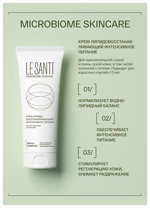 Крем липидовосстанавливающий интенсивное питание LE SANTI MICROBIOME SKINCARE разработан для ухода за сухой, очень сухой и чувствительной кожей. Крем питает и смягчает кожу, быстро впитывается, не оставляя ощущения жирности. Крем Интенсивное питание нормализует гидро-липидный баланс кожи, образует защитный слой, препятствующий потере влаги. Отлично подходит для защиты кожи в осенне-зимный период. Видимый результат на 21 день применения.