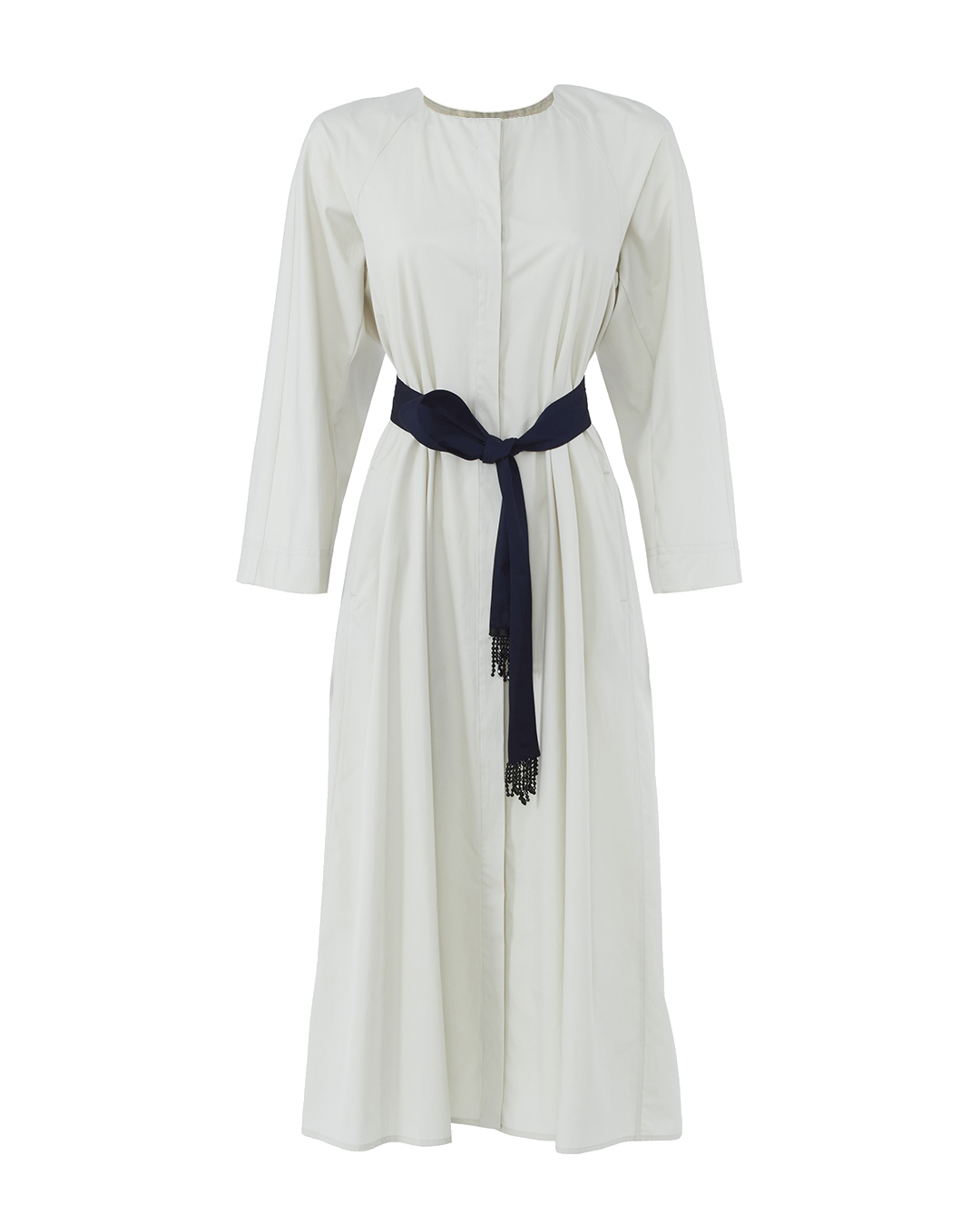 Платье Max Mara из новой весенне-летней коллекции 2022 сшили из хлопка молочного оттенка. Модель длины макси лаконичного кроя с круглой линией выреза. Платье дополнено контрастным поясом с отделкой стеклярусом.
