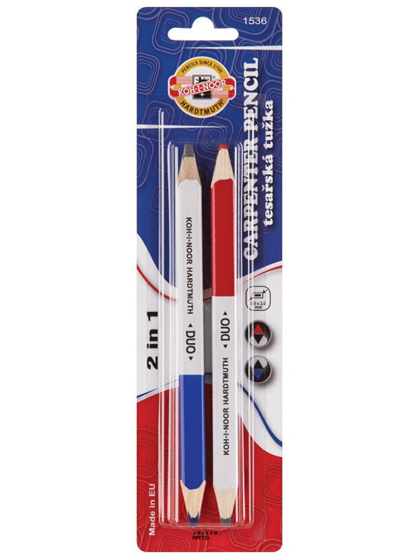 Столярный карандаш Koh-I-Noor Duo - двусторонний: с плоским грифелем в сочетании с графитовым грифелем 2B и цветным грифелем, красным или синим.
