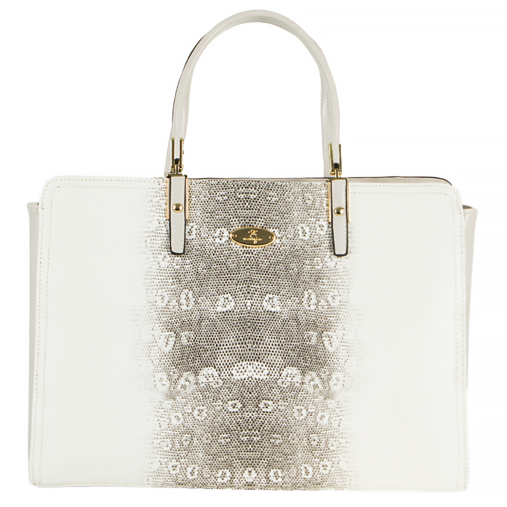 Элегантная вместительная сумка от торговой марки Marzia из искусственной кожи молочно-кофейного цвета с тиснением под змеиную кожу с контрастными запаянными краями. Модель с двумя плотными изящными ручками, съемным нерегулируемым плечевым ремнем. Отделение на молнии. Внутри: фирменная подкладка, средник и карман на молнии, два накладных кармана. На задней стороне – карман на молнии. Дно оснащено металлическими ножками для защиты от износа. Подходит для документов формата А4.
