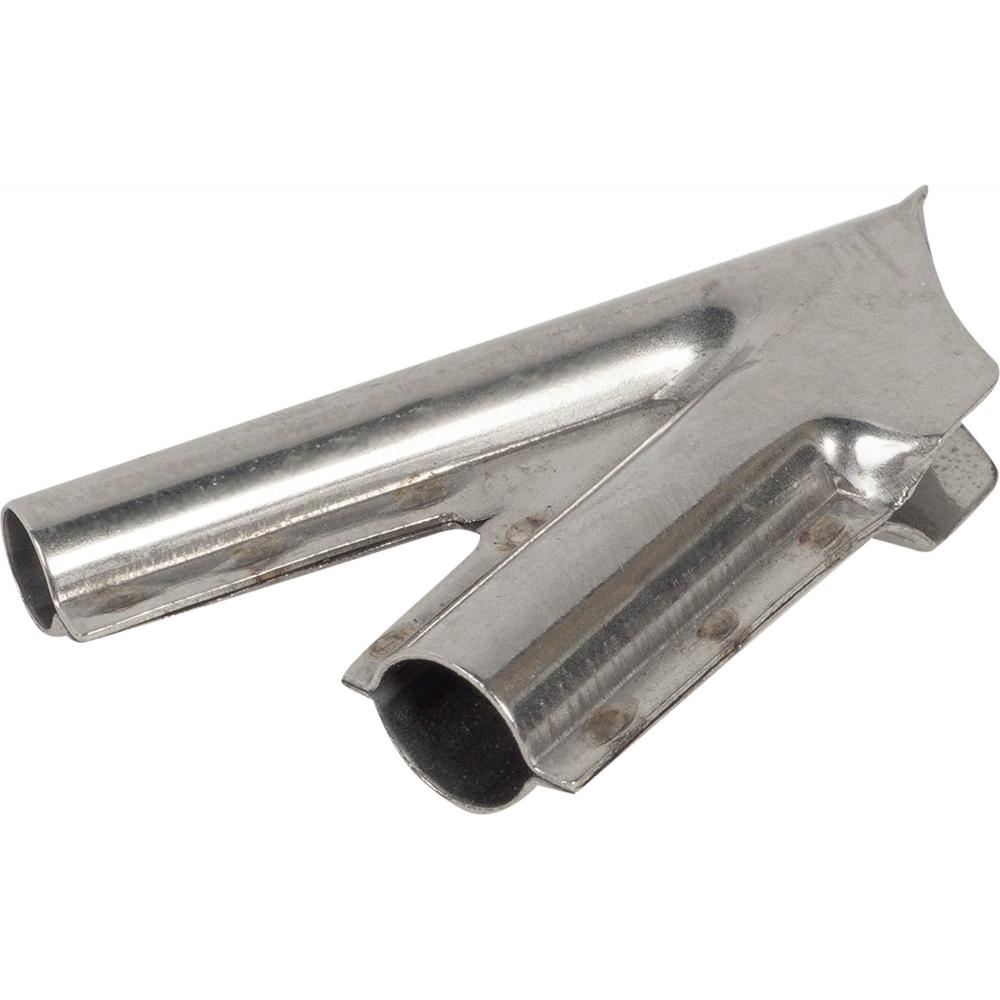 Насадка изготовлена из стали, состоит из двух трубчатых частей: посадочной — для крепления к соплу строительного фена, и подающей — под пластмассовый припой в виде прутка. Плотный компактный аксессуар удобен в применении, к стальной поверхности не прилипает припой. Страна производства — Китай.