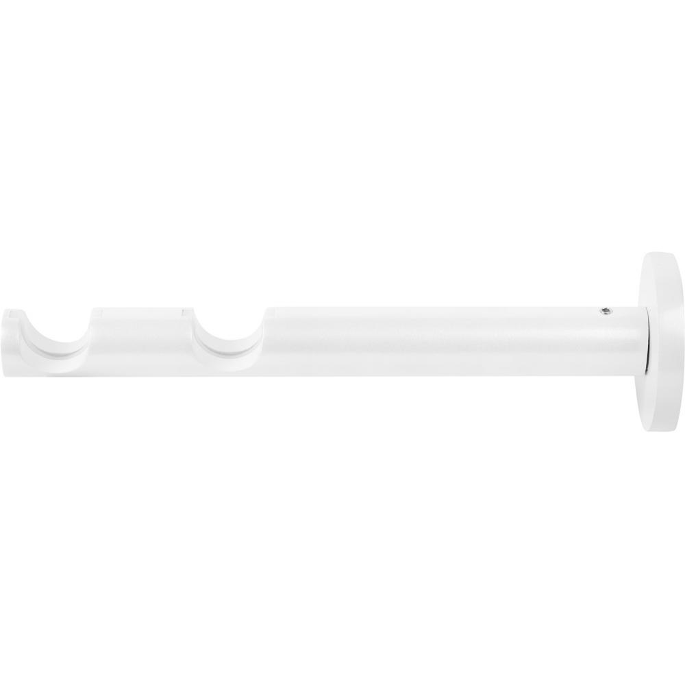 Держатель двухрядный представляет собой кронштейн с пластиковой вставкой, который крепится к стене. Изделие служит опорой для двух направляющих штанг карниза диаметром 20 мм. Основной материал — алюминий с декоративным глянцевым покрытием цвета «жемчуг». Винты входят в комплект поставки.