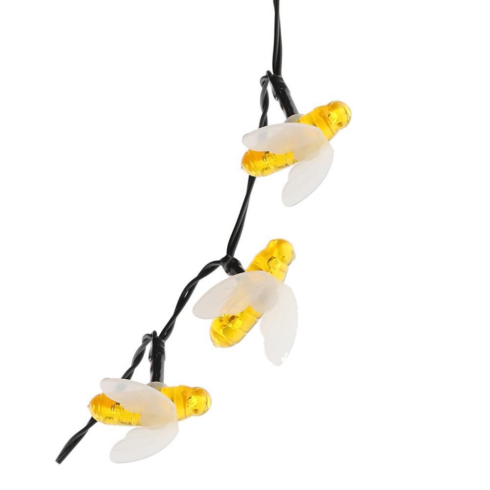 Гирлянда «Пчелки» на солнечных батареях — оригинальное украшение для дома и приусадебного участка. Представляет собой прозрачный кабель длиной 5,8 м, на котором закреплены 20 светодиодов в форме желтых пчел с бесцветными крылышками. Устройство имеет степень защиты IP44 и широкий диапазон рабочих температур (от -20 до +35 °C), при полном заряде аккумулятора способна светить до 8 часов подряд.