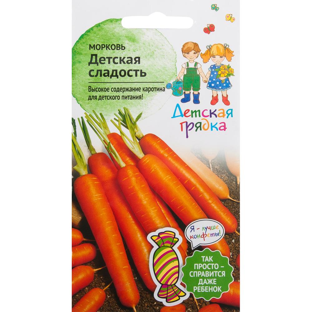 Морковь «Детская сладость» — среднеранний сорт, вегетационный период составляет 90-100 суток, на пучок можно снимать через 40-50 дней. Корнеплоды конические, тупоконечные, выровненные, достигают в длину 17-20 см, набирают вес до 200 г. Мякоть сочная, сладкая, с повышенной концентрацией каротина. Урожайность высокая. Сорт рекомендован для потребления в сыром виде и для детского рациона.