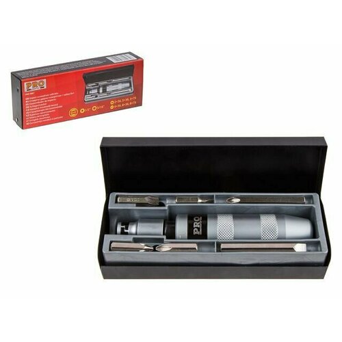 Отвертка ударно-поворотная с набором бит PRO STARTUL 7 предметов () предназначена для монтажа и демонтажа резьбовых соединений с применением значительных усилий. Посадочным размер бит - 5/16". Рукоятка металлическая, с рифлением. Упаковка - металлический кейс.