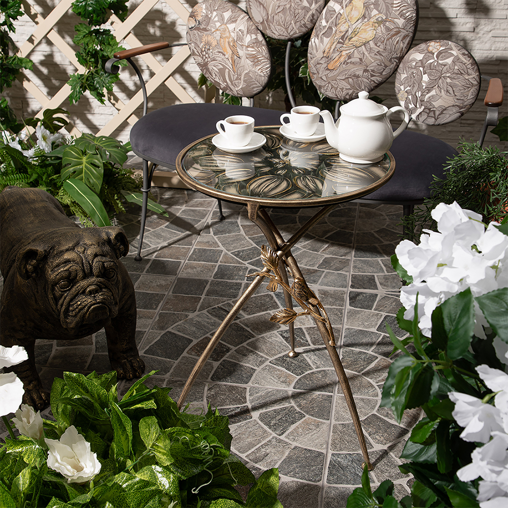 Декоративный столик BOGACHO Зарнички Санфлауэр золотистый, со стеклянной столешницей и основанием из кованой стали (ручная работа) это оригинальный дизайн, изысканность и высочайшее качество исполнения. Он выполнен вручную, что делает его уникальным, единственным в своем роде!Большой цветок и маленькие птички на нем этот образ во все времена нес в себе положительную энергетику. Коллекция Зарнички - дань той красоте, которой щедро окружает нас природа, экостиль, столь популярный в последнее время.Наполните образ своего дома оригинальностью и неповторимостью вместе с эксклюзивными изделиями BOGACHO.