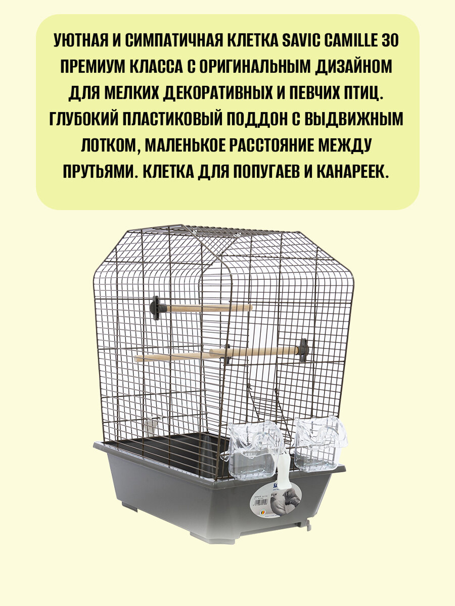 Клетка для птиц Savic Camille 30 - это уютный и надежный домик для вашего питомца. Глубокий пластиковый поддон с выдвижным лотком, маленькое расстояние между прутьями создадут дополнительный комфорт. В комплекте две кормушки, три пластиковые жердочки в форме веток.