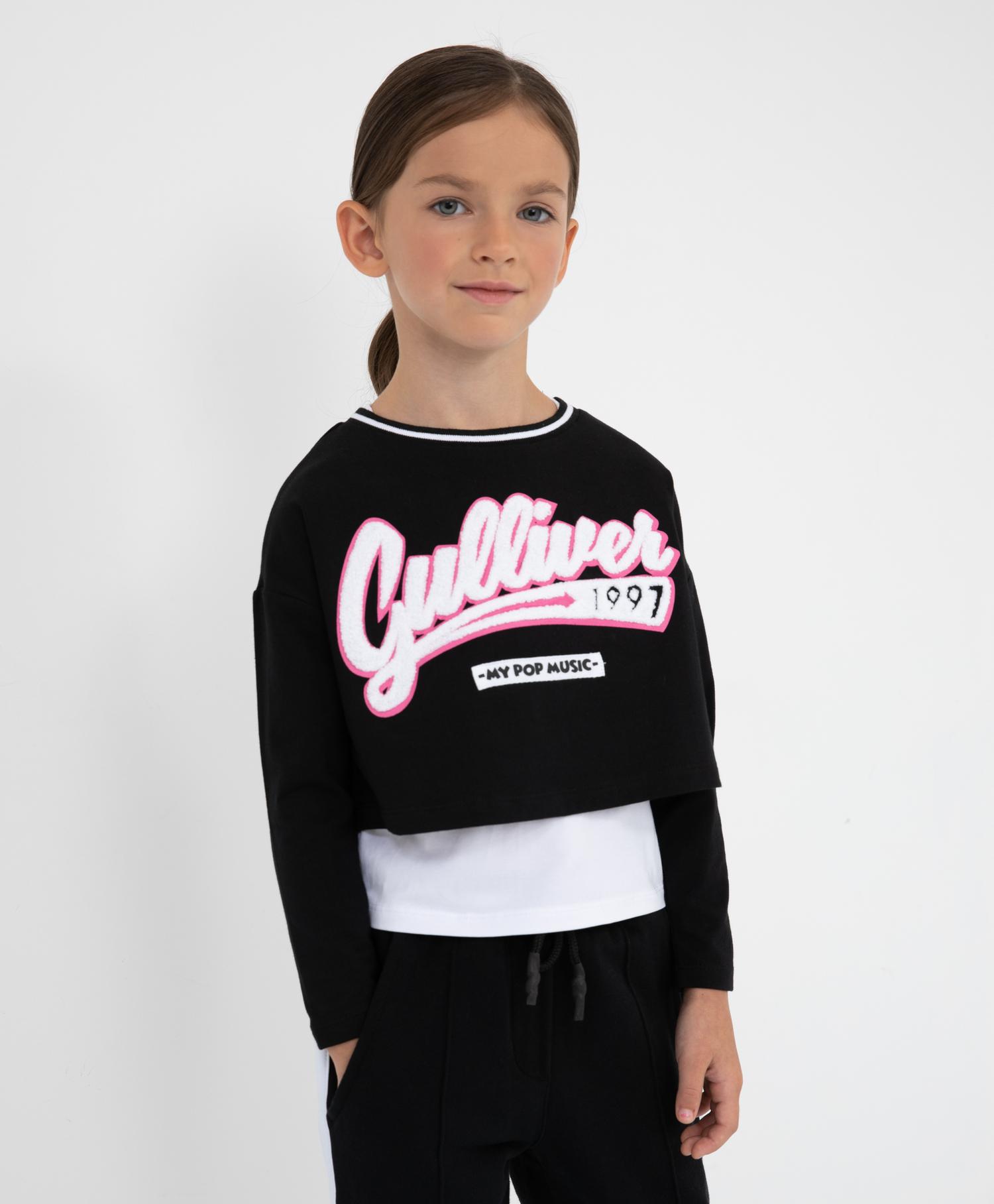 Эта модель – не имитация многослойности, а два изделия в одном комплекте! Нижний слой: удлиненная белая майка прямого силуэта и верхний слой: укороченная футболка с длинным рукавом силуэта оверсайз создают яркий модный комплект, построенный на контрасте. На черной футболке расположен интересный шрифтовой декор, решенный в технике петельчатой вышивки, полимерного принта, настрочной тесьмы.