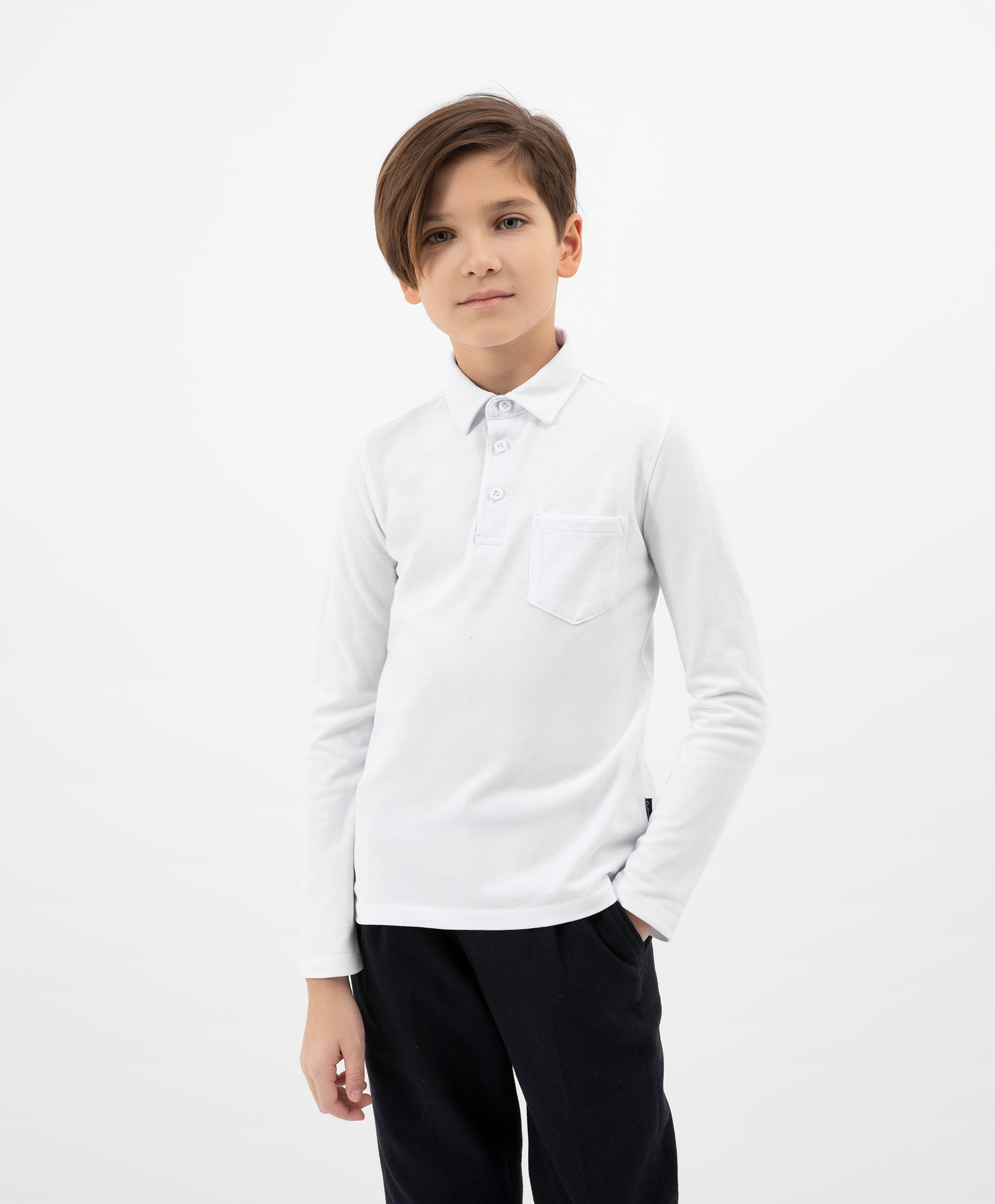 Белое поло с длинным рукавом, выполненное из трикотажного полотна "пике", – прекрасное решение на каждый день. В дни, не предполагающие важных школьных мероприятий, поло - лучшая альтернатива строгой сорочке. Модная форма с удлиненной линией спинки, лаконичная интеллигентная отделка и продуманные детали придают изделию стиль и индивидуальность.