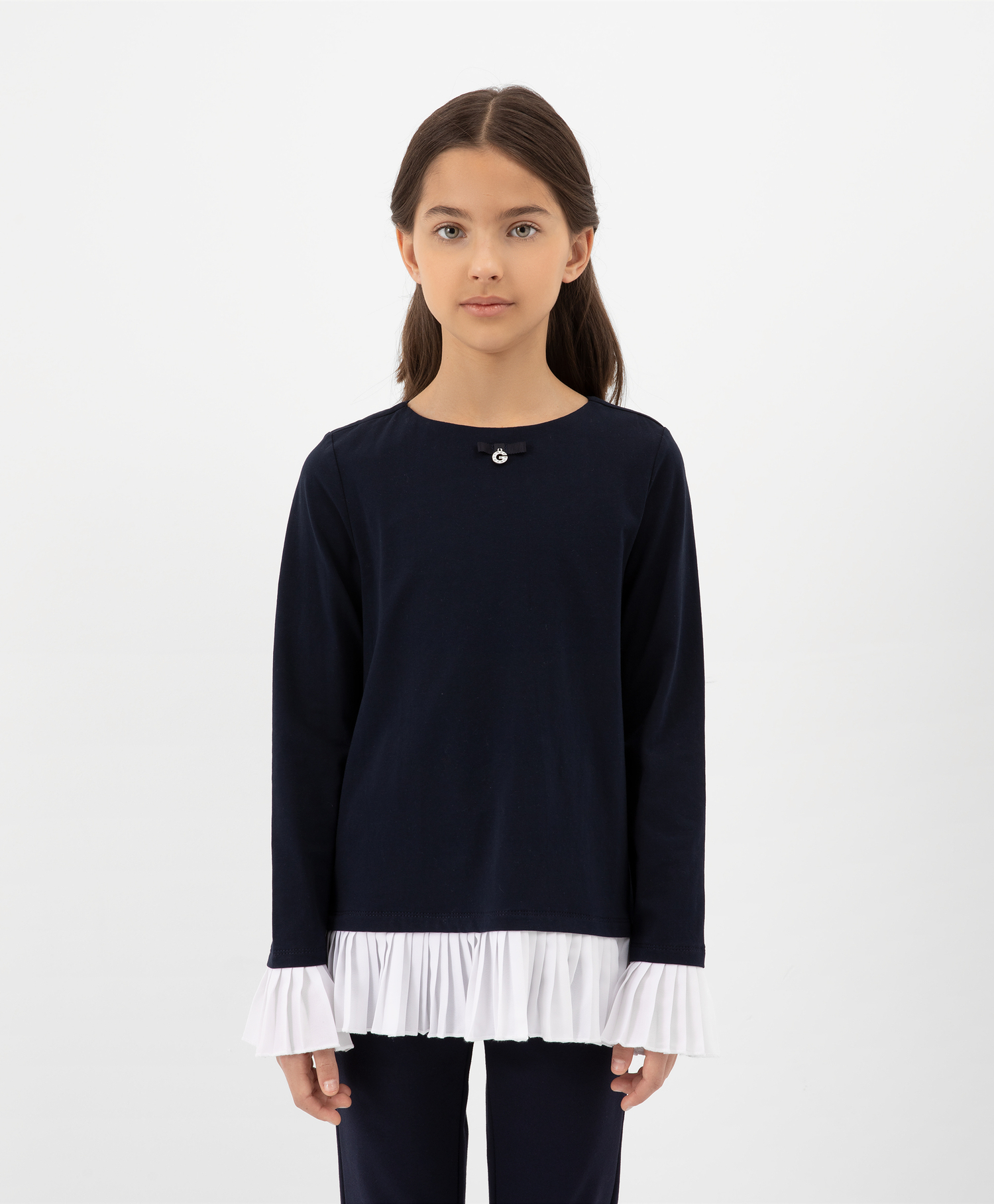 Синяя трикотажная блузка с белой плиссированной отделкой, имитирующей многослойность, - прекрасный повседневный вариант. Великолепное качество трикотажного полотна создает приятные тактильные ощущения. Легкая трапециевидная форма изделия гарантирует школьнице свободу движений. Деликатный репсовый бантик с металлической навеской придает модели индивидуальные черты, делает блузку завершенной. С любыми брюками, джинсами, юбкой, блузка составит стильный элегантный комплект, подчеркивающий культуру подачи образа девочки.