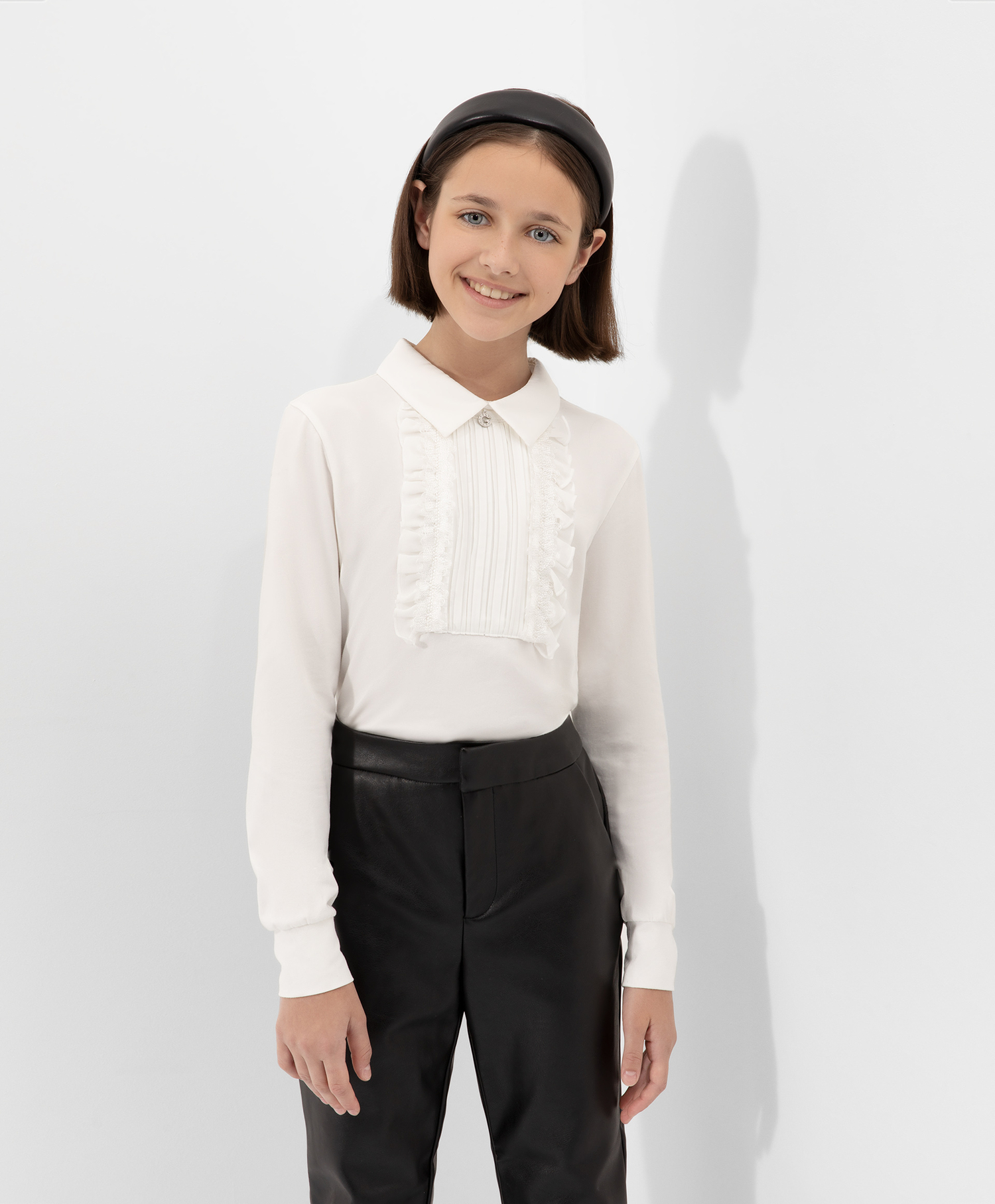 Трикотажная блузка с вставкой из плиссированного текстиля, отделанного рюшами из шифона и кружевом, - бестселлер Gulliver! Мягкая, пластичная, комфортная, блузка выглядит очень нежно и женственно. Выполненная из благородного молочного трикотажного полотна с эластаном, блузка хорошо держит форму, приятна к телу, комфортна в эксплуатации и проста в уходе. Блузка имеет застежку-капельку на спинке, оформленную жемчужными пуговицами.