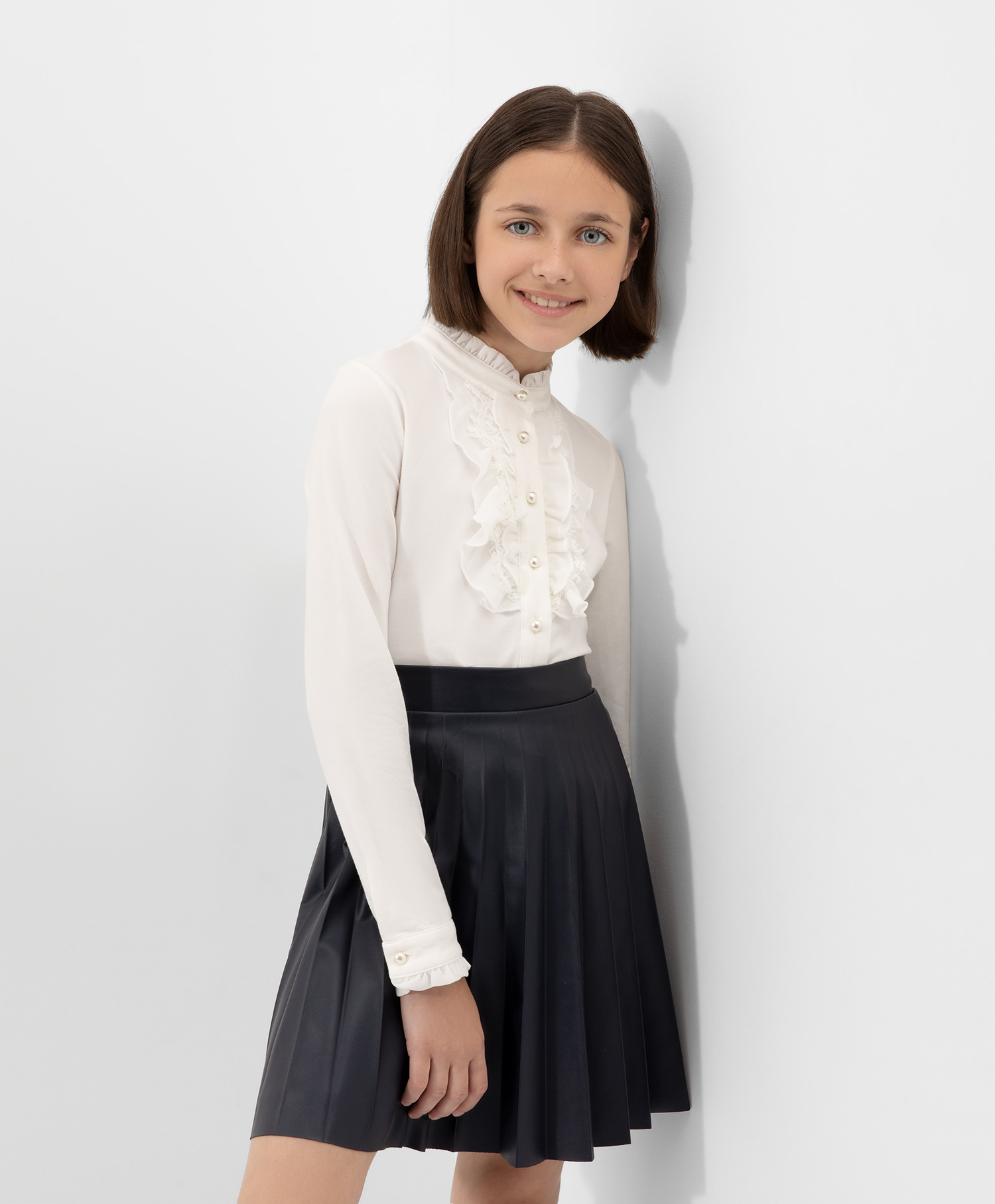 Трикотажная блузка с рюшами из шифона и кружева - бестселлер Gulliver! Мягкая, пластичная, комфортная, блузка выглядит очень нежно и женственно. Выполненная из благородного молочного трикотажного полотна с эластаном, блузка хорошо держит форму, приятна к телу, комфортна в эксплуатации и проста в уходе. Блузка застегивается на жемчужные пуговицы.
