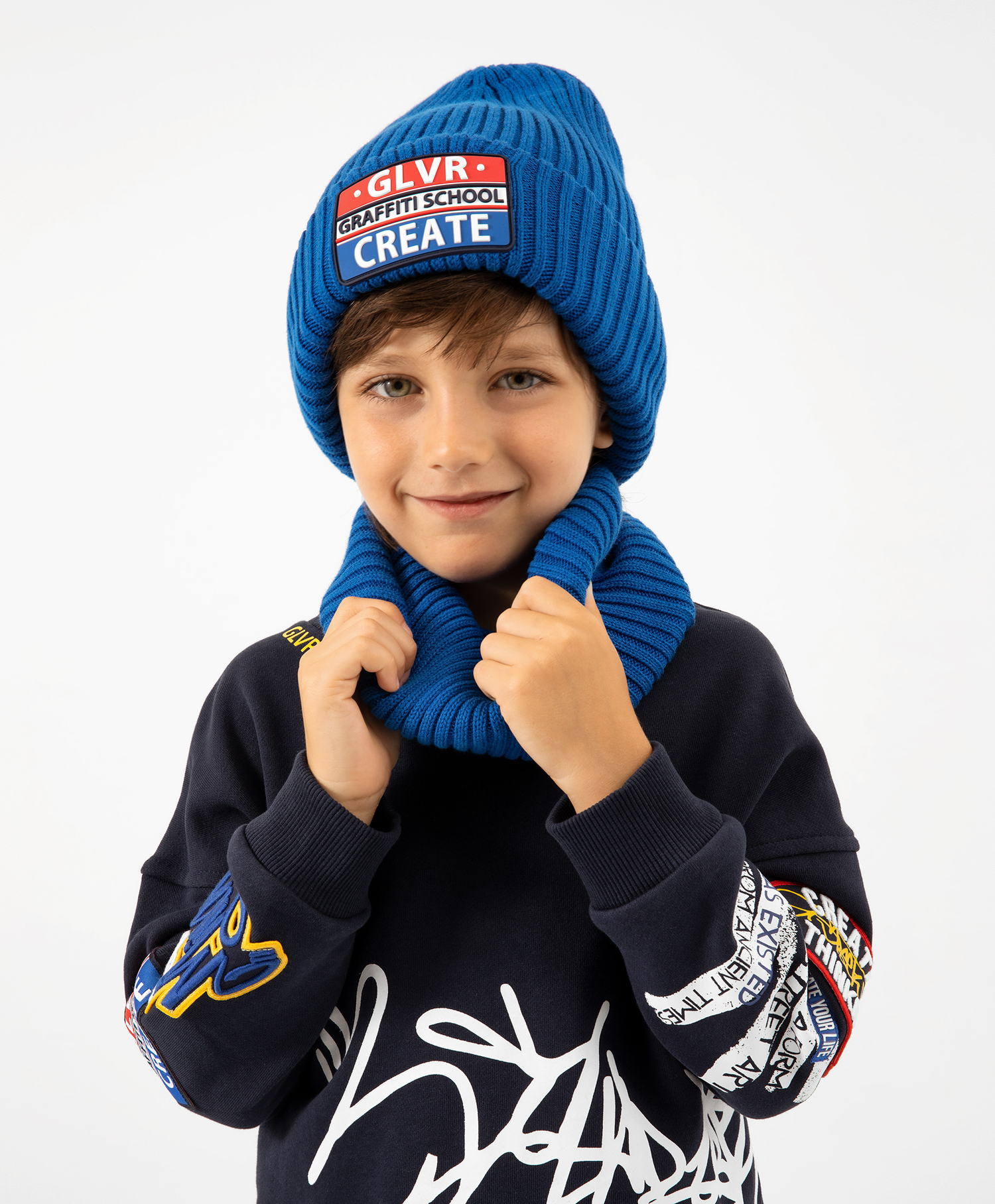 Синяя вязаная шапка из хлопковой пряжи - яркий, стильный, интересный аксессуар. Мягкая пряжа делает шапку приятной по тактильным ощущениям. Двуслойное решение позволяет носить шапку до глубокой осени. В оформлении модели использован крупный резиновый патч с шрифтовым декором.