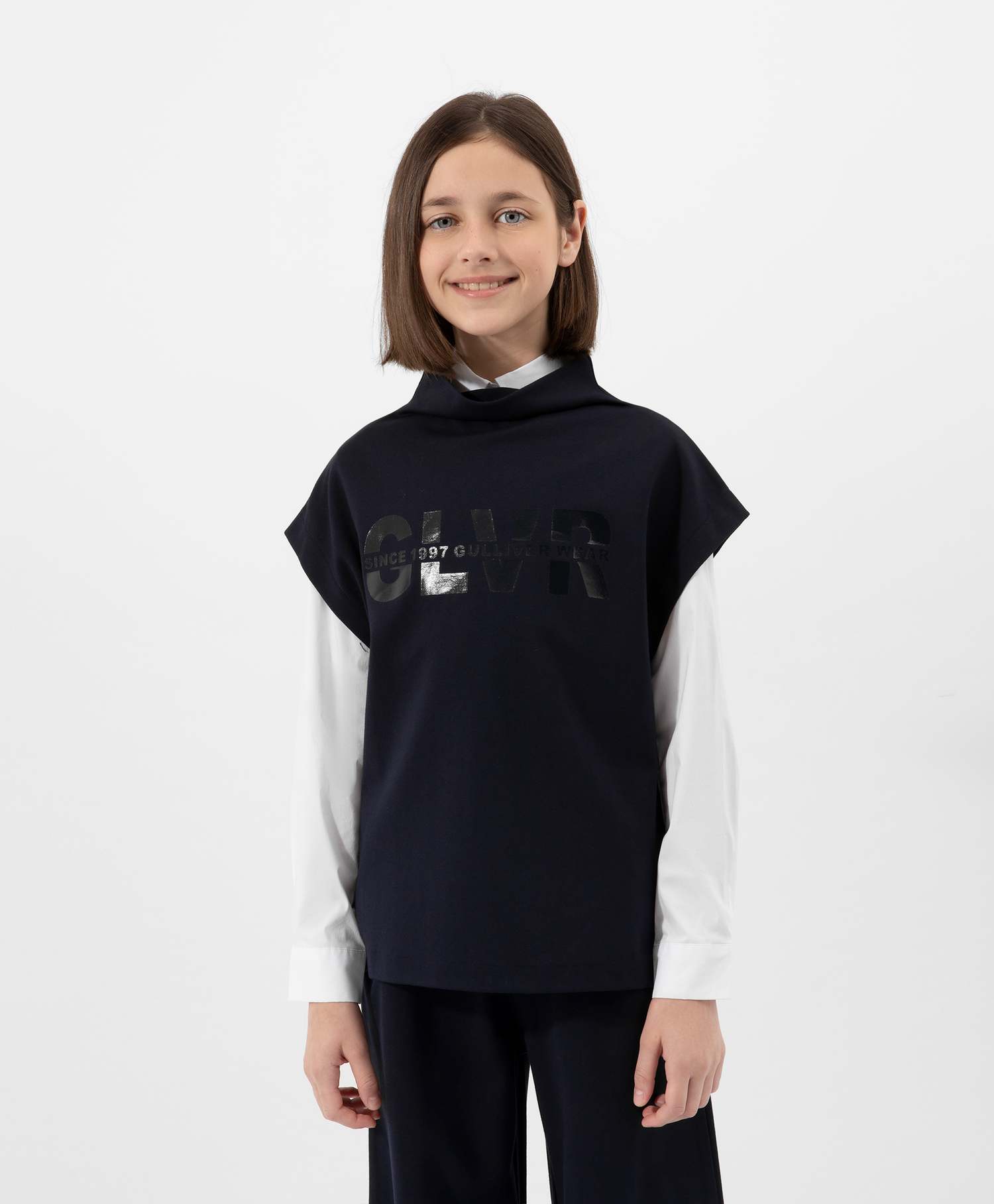 Модный синий жилет из джерси оценят девочки-подростки, предпочитающие элегантной классике современные тренды. Жилет со спущенным плечом прямой свободной формы с удлиненной линией спинки - идеальный компаньон для базовой блузки, водолазки, футболки. Изюминка модели - высокая цельнокроенная горловина, придающая образу девочки утонченность и элегантность. В оформлении жилета использован крупный шрифтовой глянцевый принт.