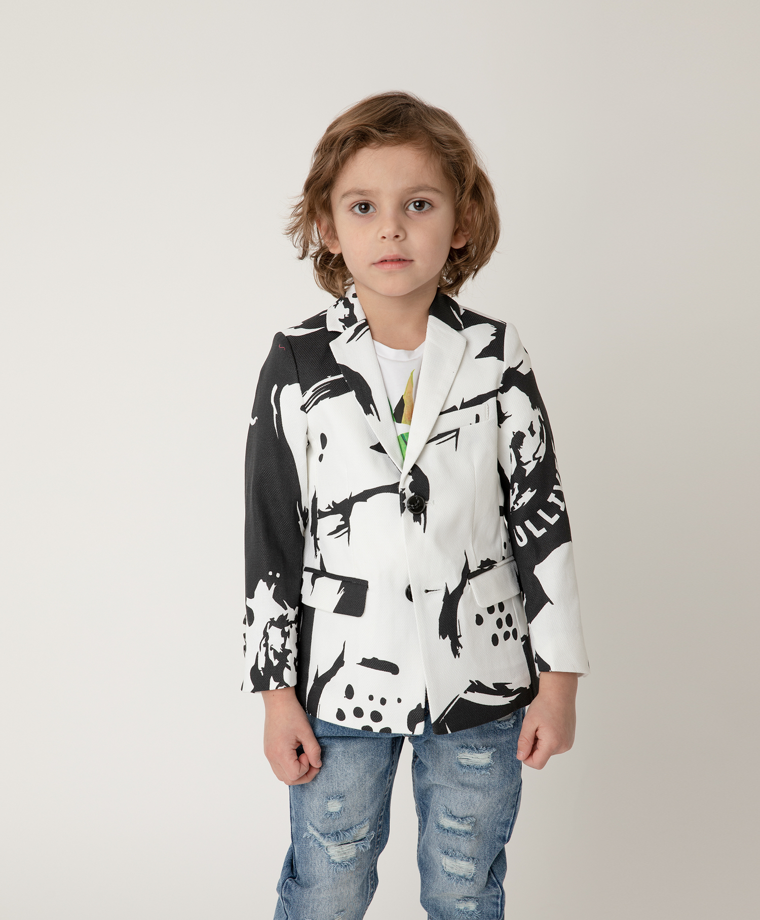 Хит коллекции “Карамбола” – стильный пиджак из фактурной принтованной ткани - подчеркнет неординарный образ мальчика. Необычным пиджак делает смелая графика принта. В таком пиджаке сложно остаться незамеченным. С джинсами, шортами, брюками и рубашкой пиджак составит яркий экстравагантный комплект в духе времени.