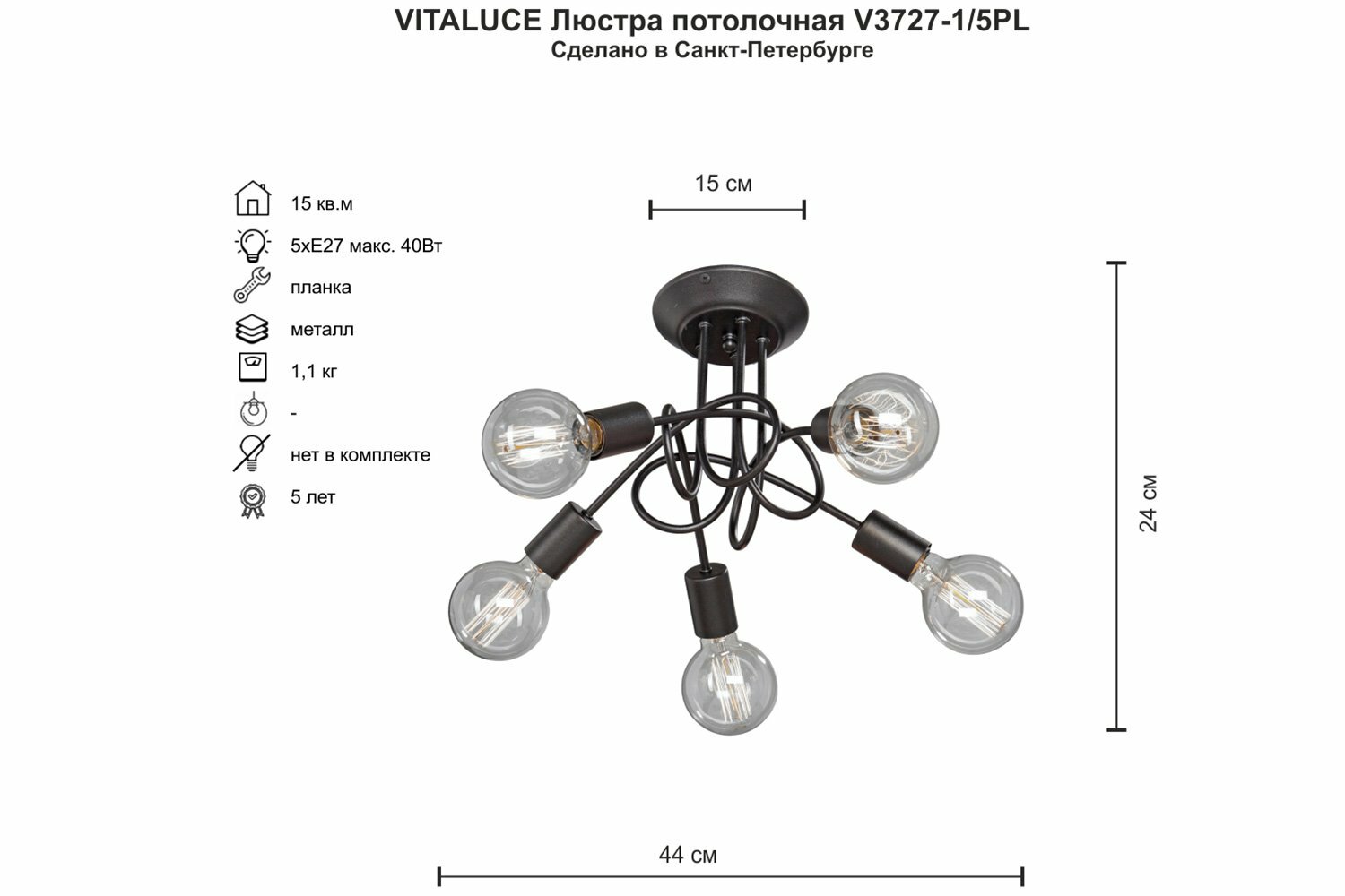 Потолочная люстра Vitaluce – специальное оборудование, произведенное по всем стандартам. В устройстве 5 ламп. Этого хватает для создания необходимой освещенности. При производстве источника света был использован материал - Металл. Товар изготовлен в стиле лофт и обращает на себя внимание в каждом интерьере. Используйте надежные и эффектные светильники, чтобы они не просто создавали освещение, но и украшали своим присутствием интерьеры.