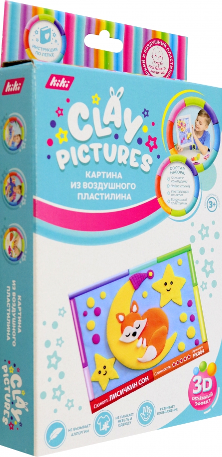 Состав набора: основа с контурами, набор стеков, инструкция по лепке, воздушный пластилин.