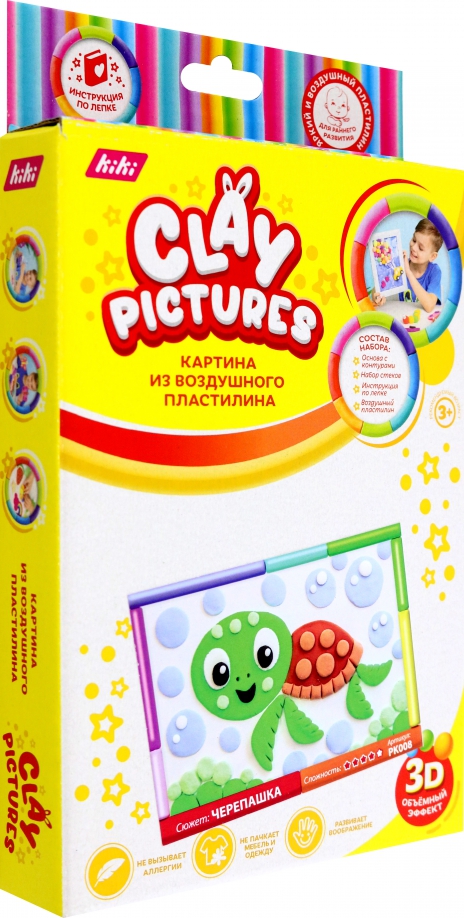 Состав набора: основа с контурами, набор стеков, инструкция по лепке, воздушный пластилин.