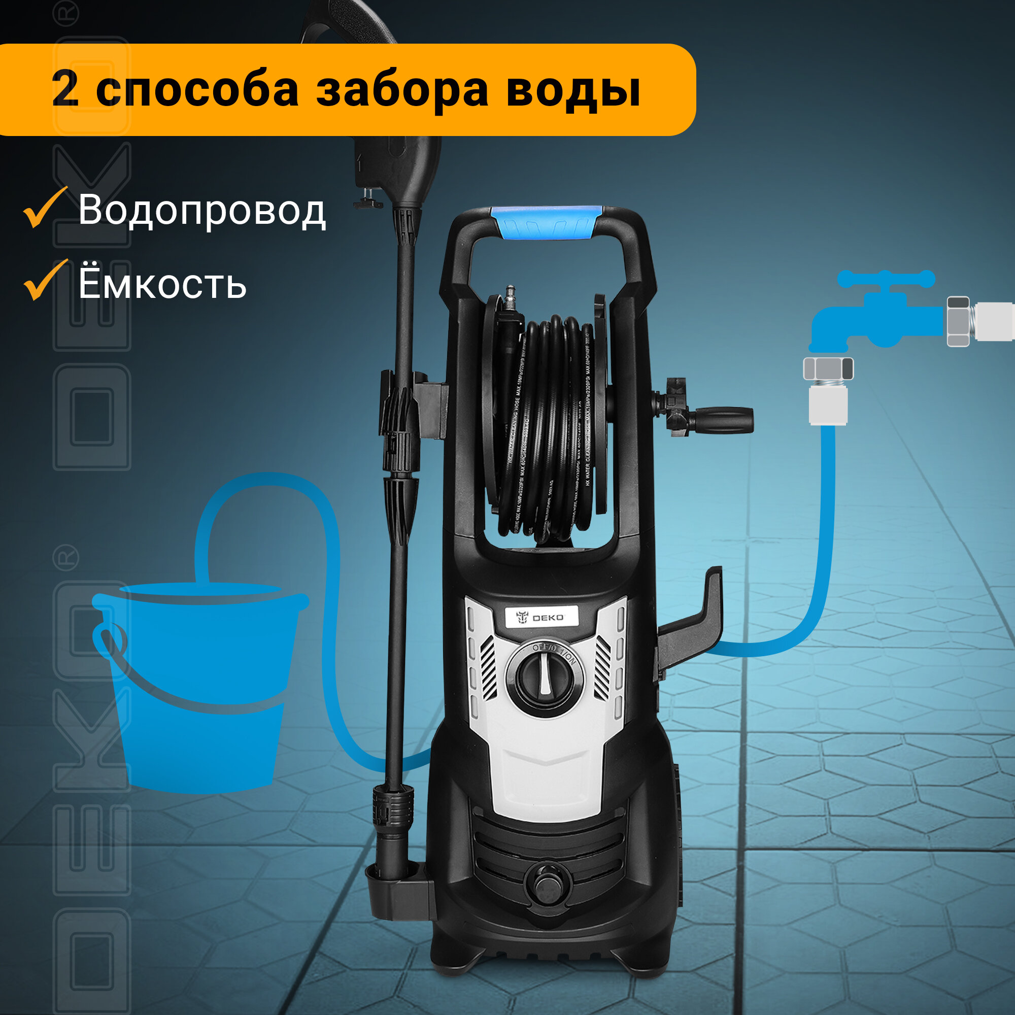 Мойка высокого давления DEKO DKCW195 PRO предназначена для мойки транспортных средств, очистки загрязненных поверхностей при помощи чистой воды под высоким давлением в бытовых условиях. Мойка обладает функцией защиты от случайного запуска. Колеса и ручка для перемещения позволяют легко и быстро переносить мойку к местам выполнения работ. Модель оснащена катушкой и держателем для аккуратного хранения провода и шланга высокого давления. Технические характеристики: Напряжение: 220 - 240 В Мощность: 2400 Вт Максимальное давление: 195 бар Производительность: 420 л/ч Длина шланга: 8 м Емкость для моющего средства: 250 мл Комплектация: Мойка высокого давления DEKO DKCW195 PROПистолет Шланг высокого давленияНасадка-распылитель Насадка-щёткаЕмкость для моющих средств