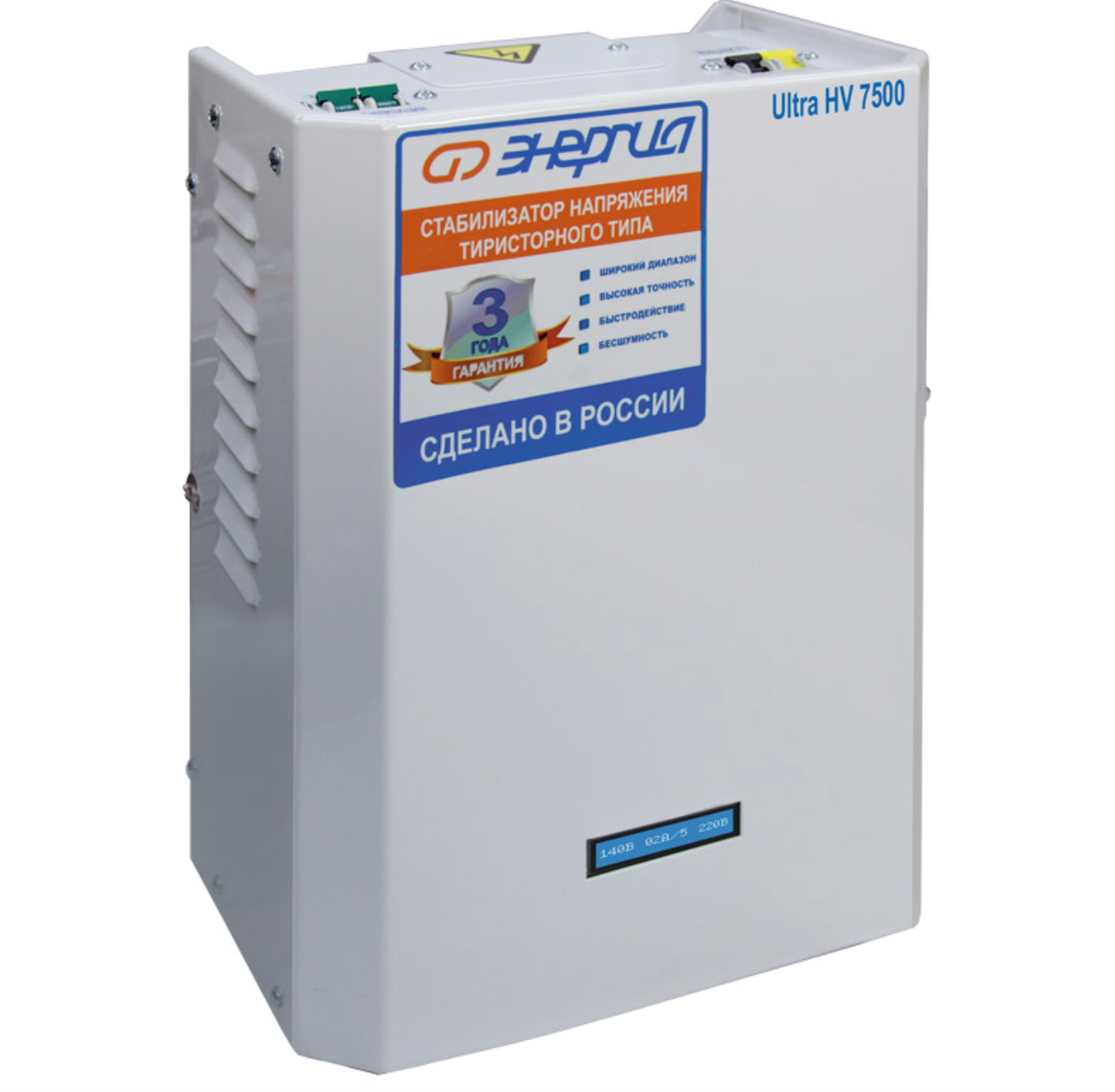 Современный качественный стабилизатор тиристорного типа, ориентированный на сети с чрезмерно высоким вольтажом (под сети с аномально низким напряжением мы предлагаем модель Энергия Ультра 7500). Мощность 7,5 кВА позволяет подключать нагрузку до 6 кВт. Ключевые преимущества этого аппарата – долговечность, бесшумность, эффективность против различных сетевых аномалий (экстремально высокого вольтажа, скачков напряжения), высокая точность стабилизации, морозоустойчивость.