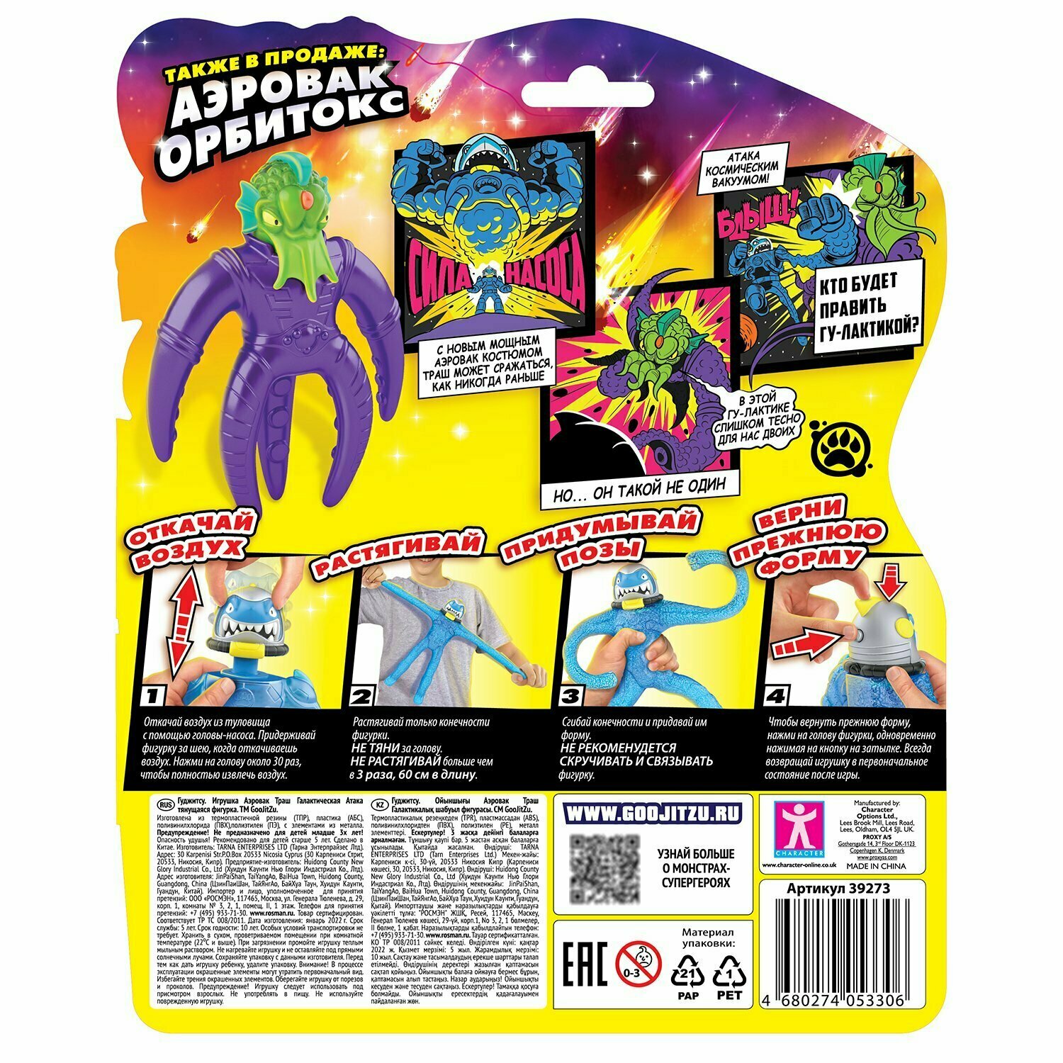 Тянущаяся фигурка Аэровак Орбитокс ТМ Гуджитсу приятна на ощупь, растягивается в 3 раза. Фигурка высотой 16,5 см наполнена пластиковыми гранулами. У Аэровак Орбитокса есть функция вакуумного насоса. Игрушка изготовлена из полимерных материалов (ТПР, АБС, ПВХ, ПЭ) с элементами из металла. Товар сертифицирован и безопасен для детей. Упаковка: блистер (19,5 х 5 х 24 см).