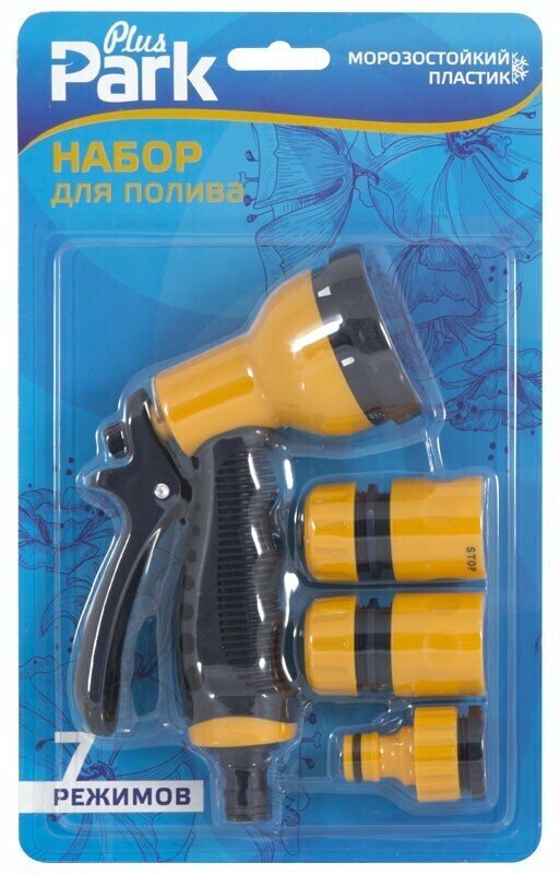 Состав набора: 1) Пистолет для полива (7 режимов) Пистолет для полива предназначен специально для направленного полива растений на садовом участке и в огороде. Удобная эргономичная прорезиненная ручка обеспечит максимальный комфорт и удовольствие при использовании. Семь режимов полива: душ, туман,диффузор, направленная струя, полив под углом, центральный полив, режим задействования всех отверстий 2) Адаптер 3/4"-1/2" 3) Соединитель 1/2" 4) Соединитель с акватопом 1/2" Материал: алюминий, высокопрочный ABS пластик, термопластичная резина давление на входе: минимум 2 Бара-максимум 6 Бар