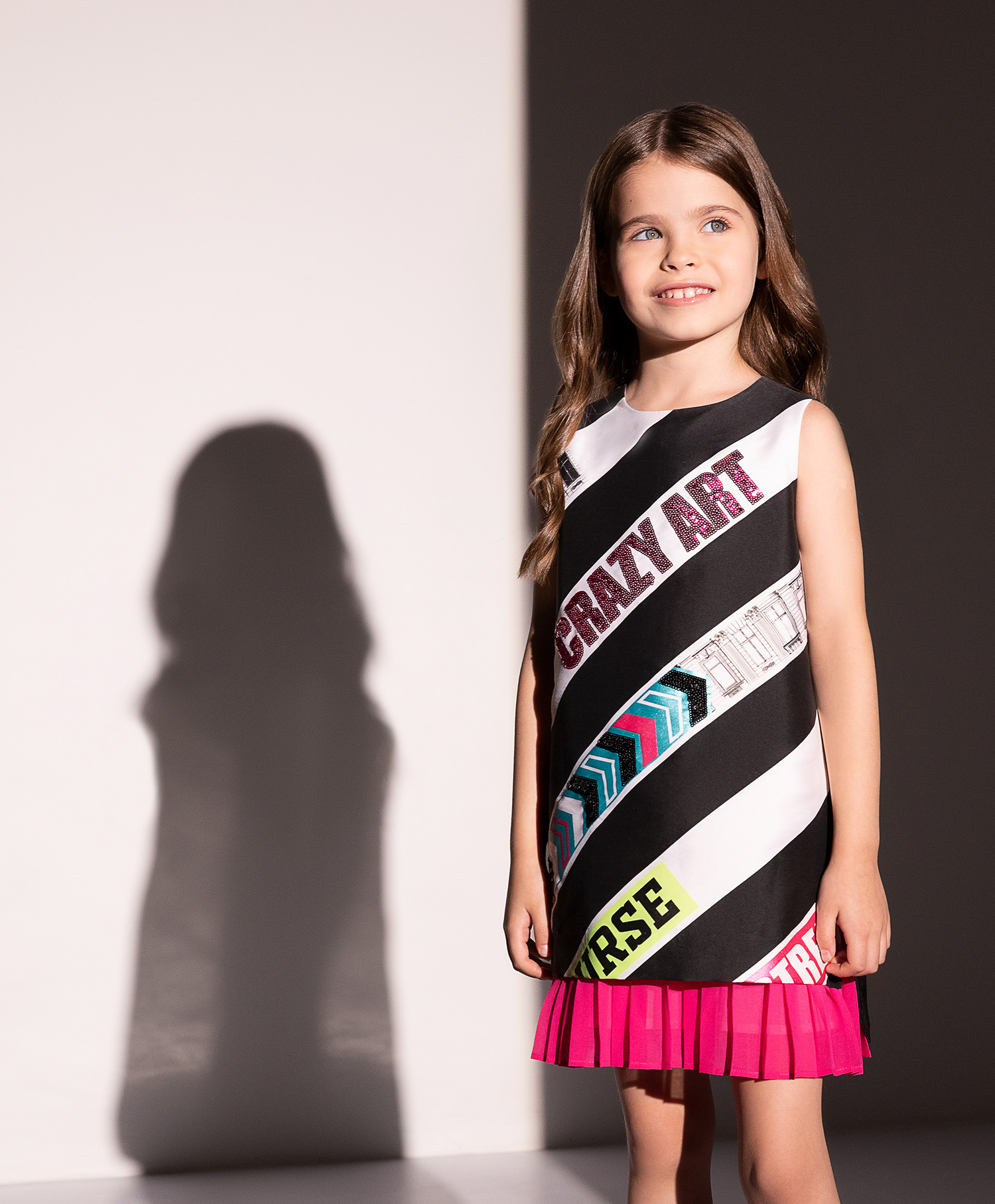 Текстильное платье без рукава подчеркнет стиль, красоту и торжественность момента! Дизайн платья построен на цветовом контрасте однотонной спинки, яркой насыщенной передней части, нижней плиссированной юбки, имитирующей многослойность. Динамичные диагональные полосы, чередующиеся с шрифтовыми элементами из сияющих пайеток, создают яркий, насыщенный цветом и фактурами фон. Платье застегивается на молнию, расположенную на спинке.