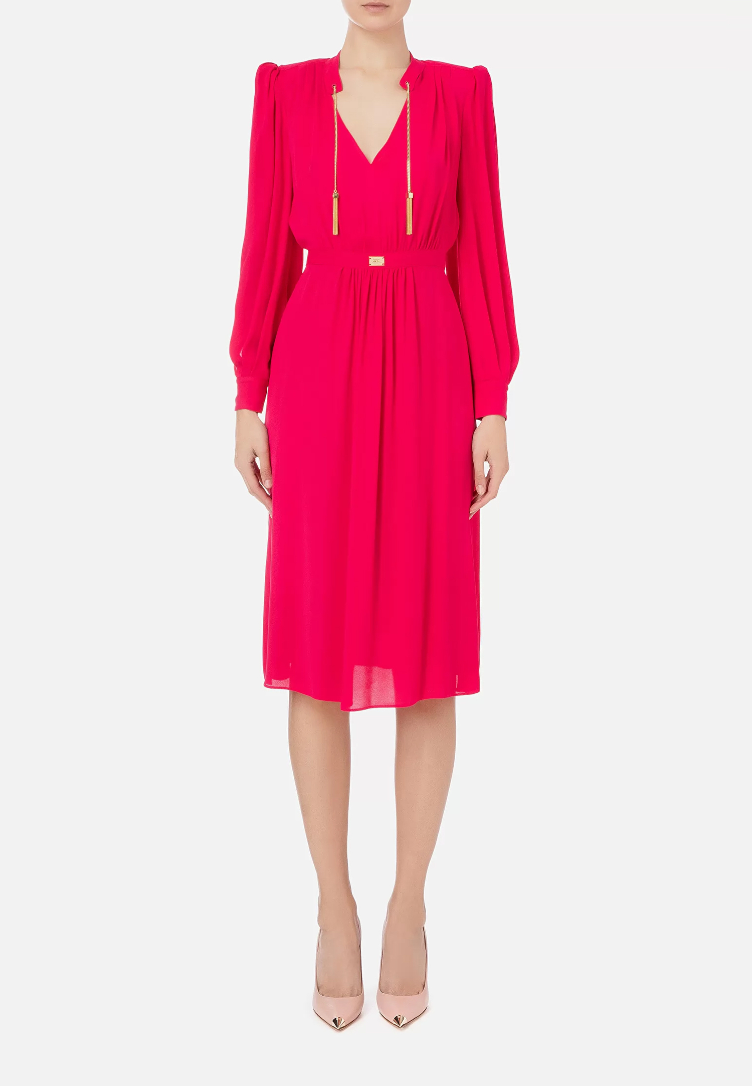 Ягодный оттенок платья миди с глубоким V- образным вырезом из новой коллекции создает красочное настроение. Элегантный крой модели с длинными рукавами и четко очерченной линией плеч структурирует фигуру, удлиняя силуэт. Ткань жоржет из шелковистой вискозы красиво драпируется ниспадающими складками, эффектно струящимися при движении. Металлические кисточки на тонких золотистых цепочках дополняют образ.