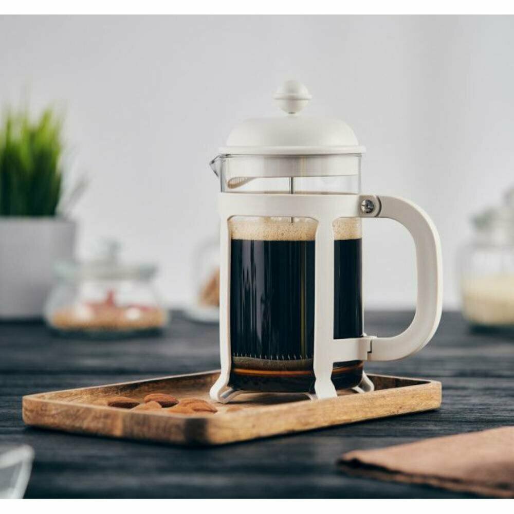 Оправа френч-пресса изготовлена из белого термостойкого пластика. Колба, объемом 800 мл изготовлена из термостойкого боросиликатного стекла, выдерживающего перепад температур от -20°C до +280°C.