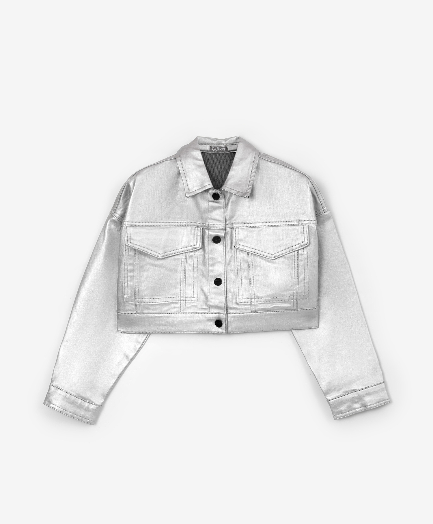 Укороченная джинсовая куртка, выполненная из денима с серебряным покрытием - яркий трендовый элемент гардероба девочки! Модная форма и конструкция модели формируют актуальные пропорции в любом комплекте. Интересная металлизированная фактура делает изделие свежим, небанальным, привлекающим внимание. В оформлении джинсовой куртки использована резиновая нашивка. Куртка застегивается на брендированные металлические кнопки.