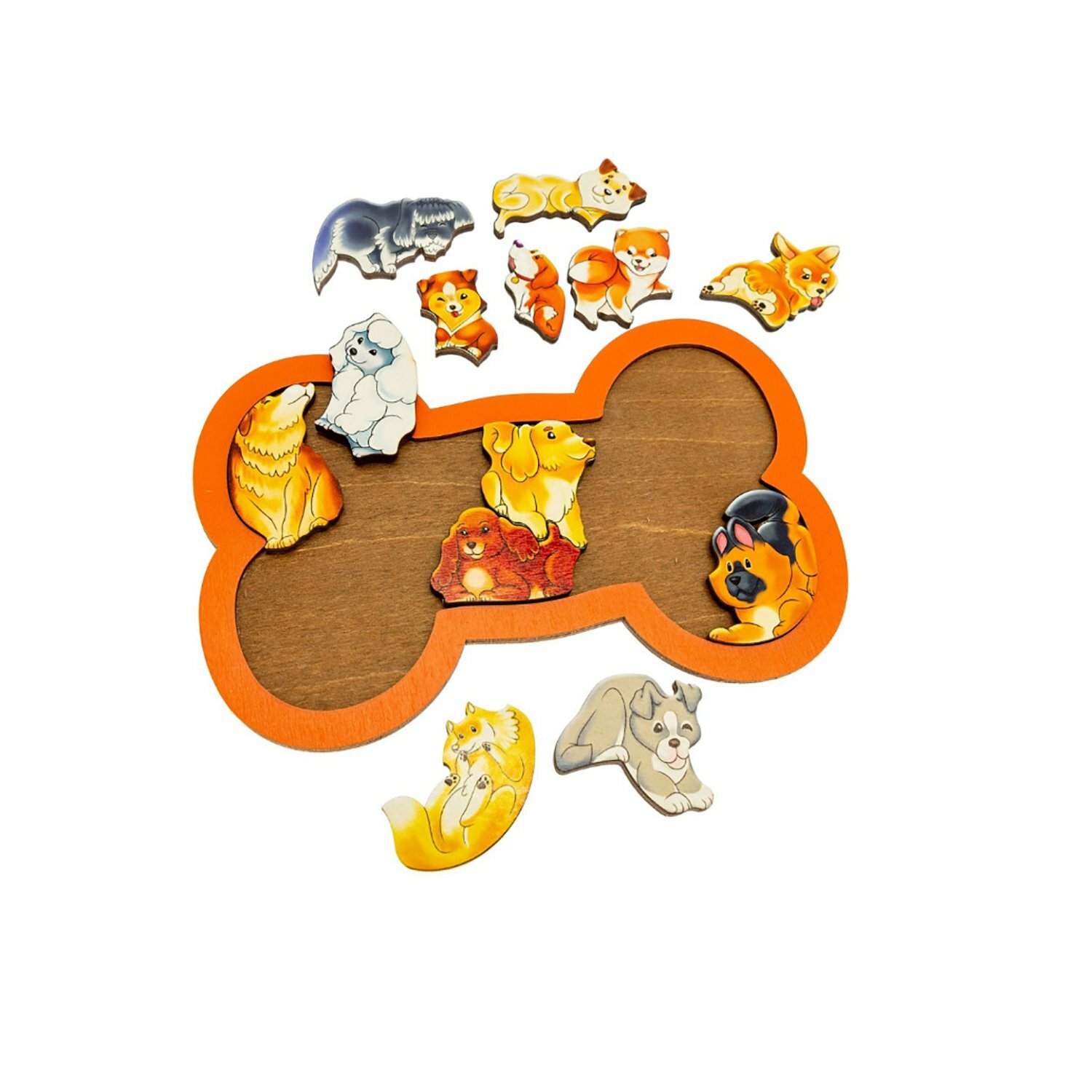 Деревянный пазл головоломка. В наборе 13 фигурок собак, которые нужно расположить на поле. На входящем в набор вкладыше приведена картинка укладки фигурок. Сначала можно предложить ребенку собирать пазл по образцу, а затем по памяти. Состав: игровое поле 18х28 см, 13 фигурок.