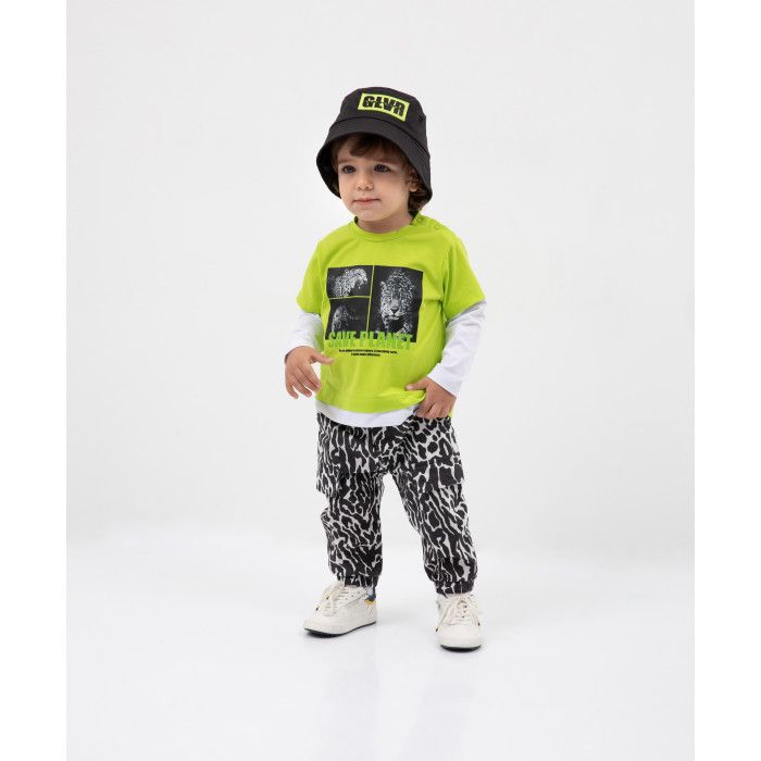 Неоновая футболка с длинным рукавом - яркий акцент весеннего гардероба мальчика! Дизайн модели построен на главных приметах спортивного стиля. Двойной рукав, имитирующий модную многослойность, цветовой контраст, крупный черно-белый фотопринт с шрифтовыми элементами формируют выразительный образ маленького модника. Футболка имеет удобную застежку на кнопках на плечевом шве.