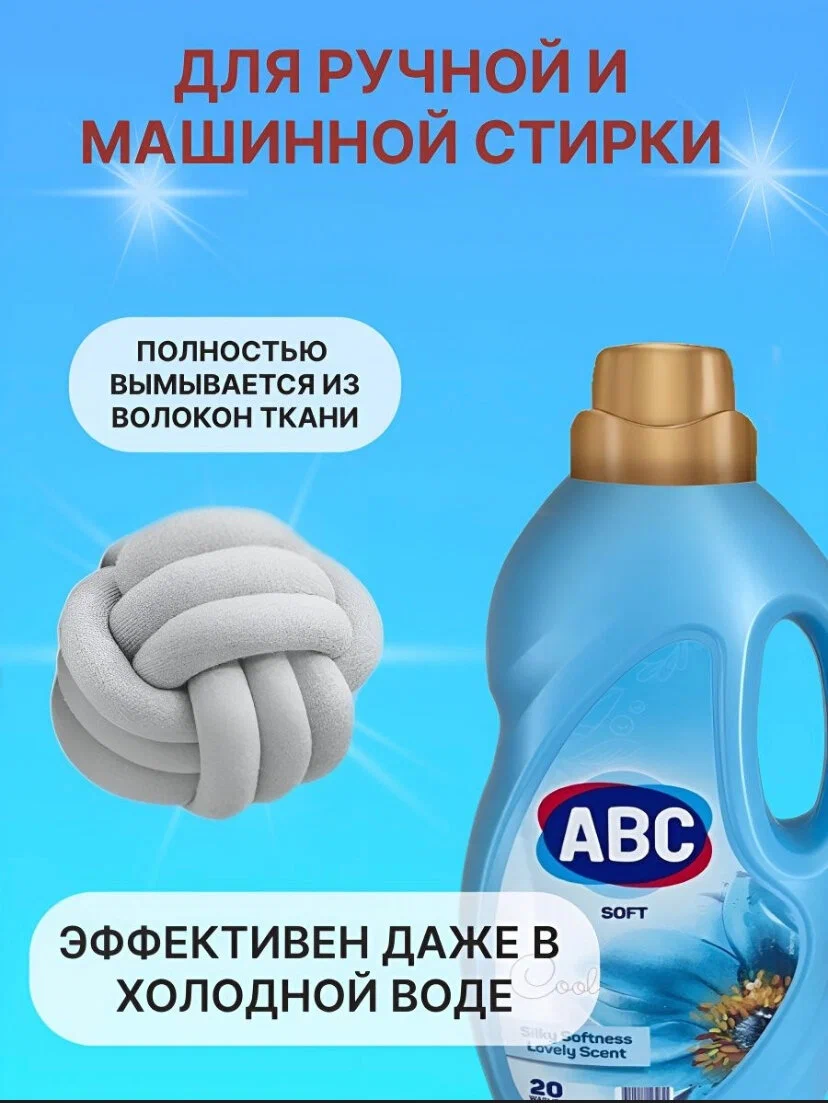 Смягчитель для белья ABC Очарование океана. Смягчитель для белья Марки АВС, выполняет функции кондиционера для стирки белья, применяются при стирке в качестве дополнительного средства. Он добавляется в воду при последнем полоскании, что делает стирку более качественной, а белье более мягким. Кондиционер придает белью антистатические свойства и приятный запах, делает его цвет более стойким и облегчает последующее глажение
